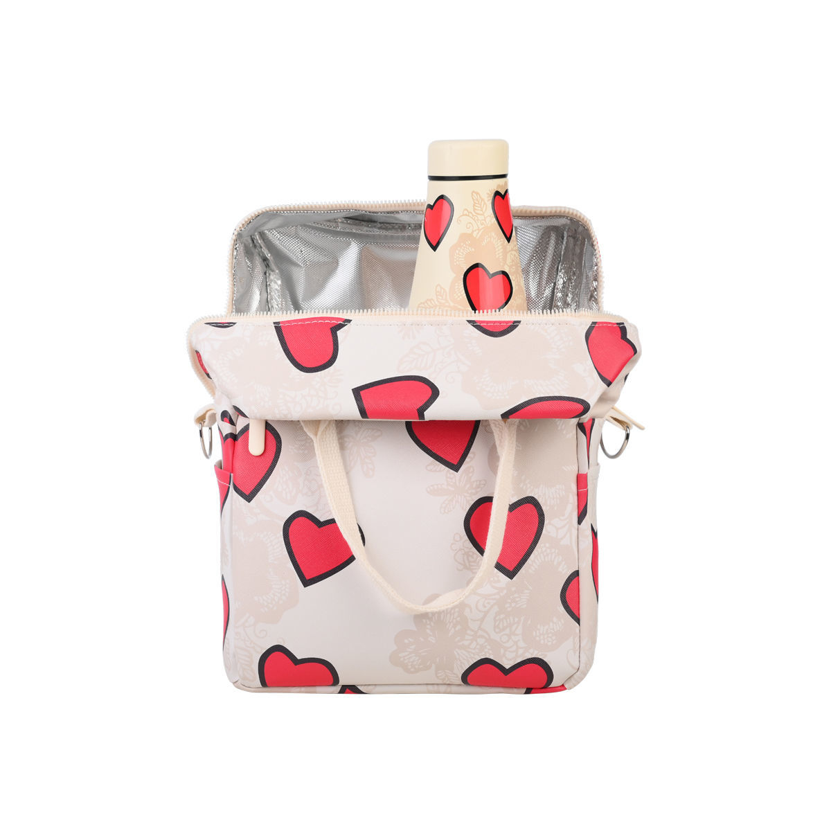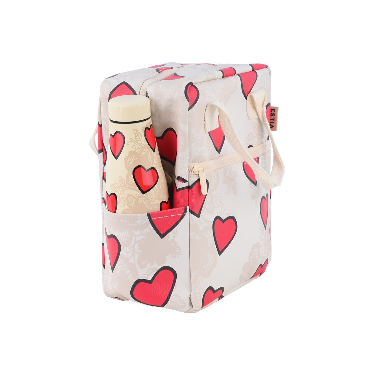 Ισοθερμική τσάντα φαγητού από την εταιρεία εstia από την σειρά "Save The Aegean". Έχει μπεζ φόντο με κόκκινες καρδιές στο σχέδιο. Η εταιρεία εstia συνεισφέρει στον οργανισμό "Save The Aegean" με 1% επί των πωλήσεων, για καθαρότερες θάλασσες και ένα καλύτερο αύριο. Η εξωτερική επιφάνεια της τσάντας είναι κατασκευασμένη από PVC leather, ένα ανθεκτικό συνθετικό υλικό που προσφέρει κομψή εμφάνιση και μεγάλη διάρκεια ζωής. Το υφασμα αυτό προσομοιώνει την εμφάνιση και υφή του φυσικού δέρματος, αλλά είναι κατασκευασμένο από PVC, ένα είδος πλαστικού. Εσωτερικά έχει ισοθερμική επένδυση που διατηρεί την θερμοκρασία του φαγητού ή του ποτού σας για περισσότερη ώρα. Διαθέτει 2 θέσεις για μπουκάλια, μία στην κύρια θήκη και μία εξωτερικά για να μένει το περιεχόμενο του μπουκαλιού σας στην κατάλληλη θερμοκρασία. Κλείνει με φερμουάρ και μεταφέρεται εύκολα χάρη στις πρακτικές λαβές της. Με εξωτερική θήκη που κλείνει με φερμουάρ για να τοποθετήσετε τα κλειδιά, το κινητό ή ότι άλλο χρειάζεστε. Ιδανική για το γραφείο, το σχολείο και οποιαδήποτε άλλη δραστηριότητα. Χωρητικότητα: 7lt.