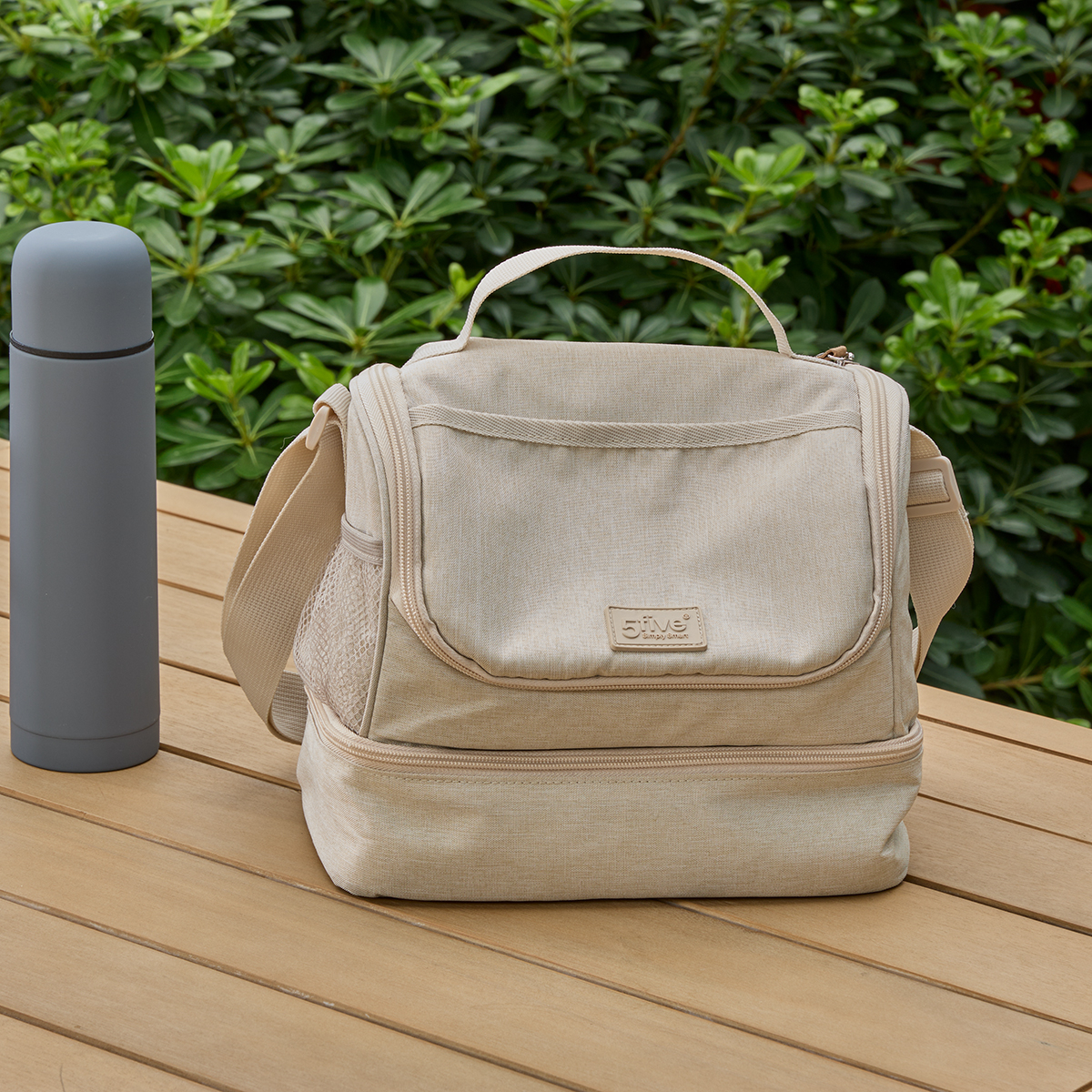 Ισοθερμική τσάντα φαγητού από ύφασμα polyester σε μπεζ χρώμα. Διαθέτει ρυθμιζόμενο ιμάντα για να την μεταφέρετε στον ώμο. Έχει 2 μεγάλες θήκες που κλείνουν με φερμουάρ και διχτάκι στο πλάι για μπουκάλι. Ιδανική για την παραλία, το camping και τις εκδρομές. Διατηρεί το περιεχόμενο ζεστό ή κρύο για 4ώρες. Χωρητικότητα 9lt.