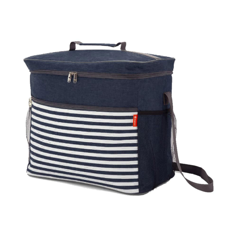 Ισοθερμική τσάντα χωρητικότητας 13 λίτρων από την εταιρεία Benzi. Είναι απαραίτητη τους καλοκαιρινούς μήνες ώστε να κρατάει δροσερά τα φαγητά και τα ποτά σας στην παραλία ή στις εξορμήσεις. Είναι κατασκευασμένη από 100% polyester σε μπλε σκούρο χρώμα με λευκές ρίγες. Έχει λαβή και λουρί μεταφοράς για να μεταφέρεται εύκολα. Διαθέτει επίσης δύο εξωτερικές τσέπες δεξιά και αριστερά με λάστιχο και μια τσέπη στο μπροστά μέρος με φερμουάρ.