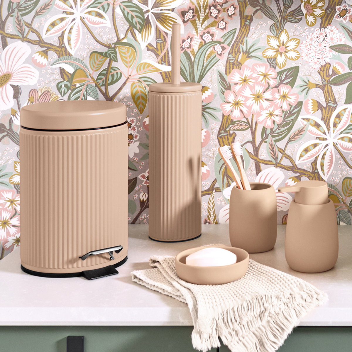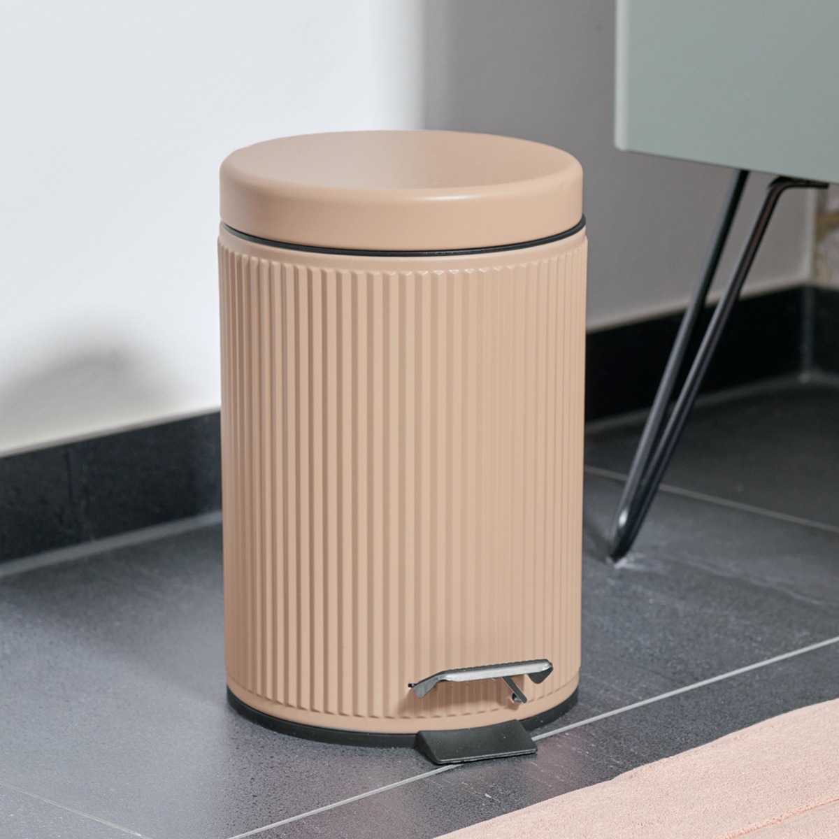 Κάδος απορριμμάτων για το μπάνιο με χωρητικότητα 3 λίτρα. Είναι κατασκευασμένος από μεταλλικό υλικό σε μπεζ χρώμα με ανάγλυφο σχέδιο. Εσωτερικά διαθέτει αποσπώμενο πλαστικό κάδο σε μαύρο χρώμα ώστε να καθαρίζεται εύκολα. Απαραίτητο αξεσουάρ για κάθε μπάνιο που θα δώσει μια μοντέρνα πινελιά. Συνδυάστε το με τα υπόλοιπα είδη της ίδιας σειράς για ένα ολοκληρωμένο αποτέλεσμα στο μπάνιο σας.