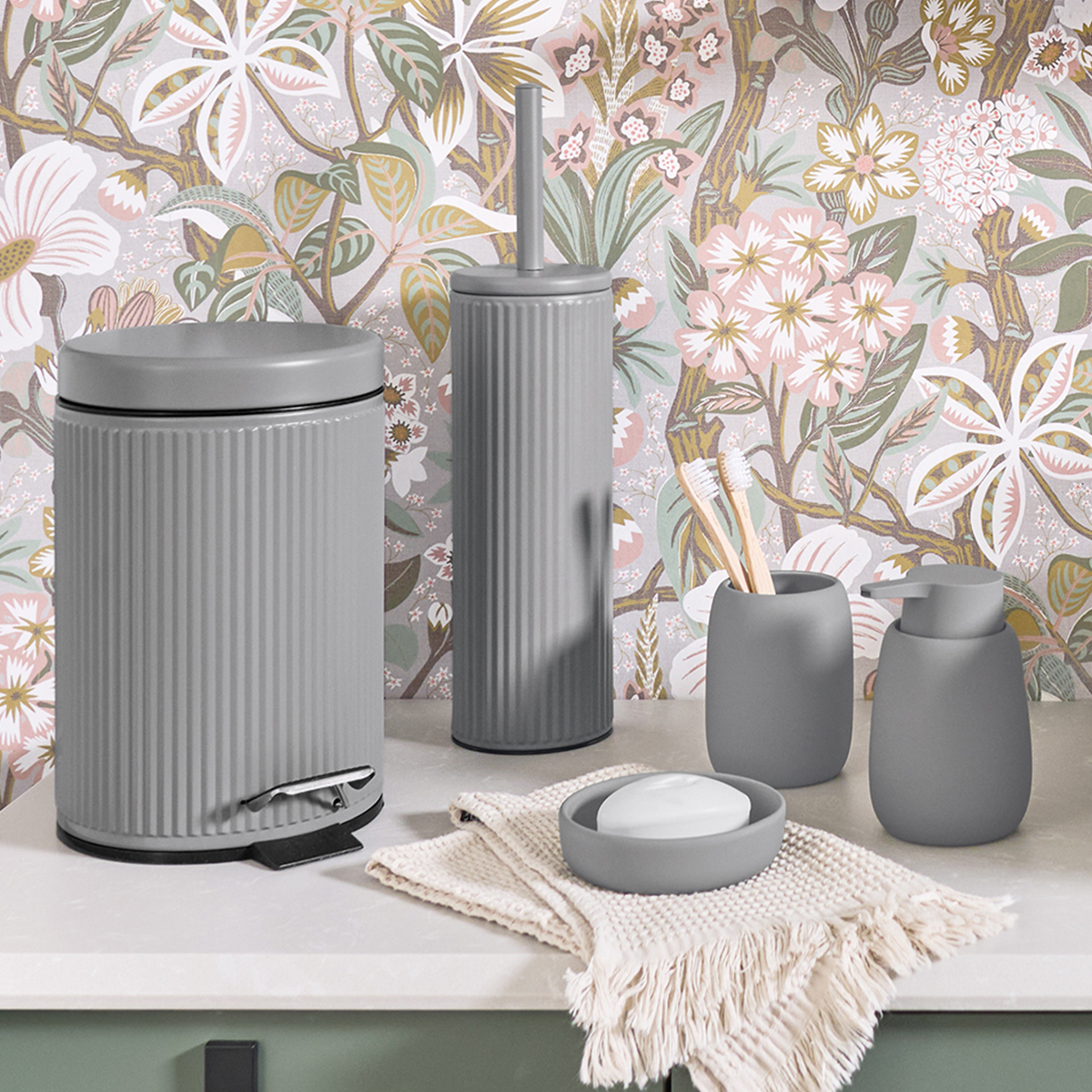 Κάδος απορριμμάτων για το μπάνιο με χωρητικότητα 3 λίτρα. Είναι κατασκευασμένος από μεταλλικό υλικό σε γκρι χρώμα με ανάγλυφο σχέδιο. Εσωτερικά διαθέτει αποσπώμενο πλαστικό κάδο σε μαύρο χρώμα ώστε να καθαρίζεται εύκολα. Απαραίτητο αξεσουάρ για κάθε μπάνιο που θα δώσει μια μοντέρνα πινελιά. Συνδυάστε το με τα υπόλοιπα είδη της ίδιας σειράς για ένα ολοκληρωμένο αποτέλεσμα στο μπάνιο σας.