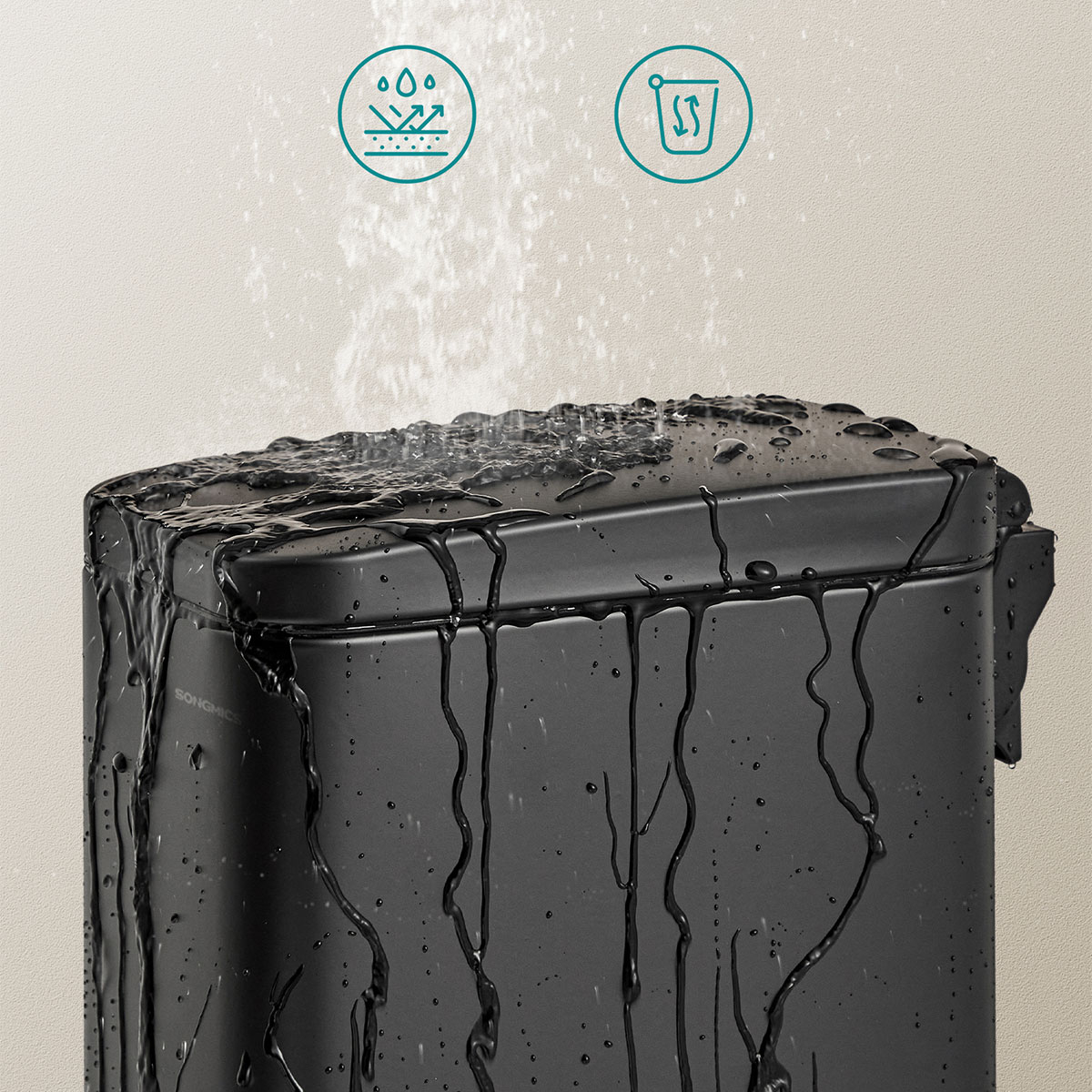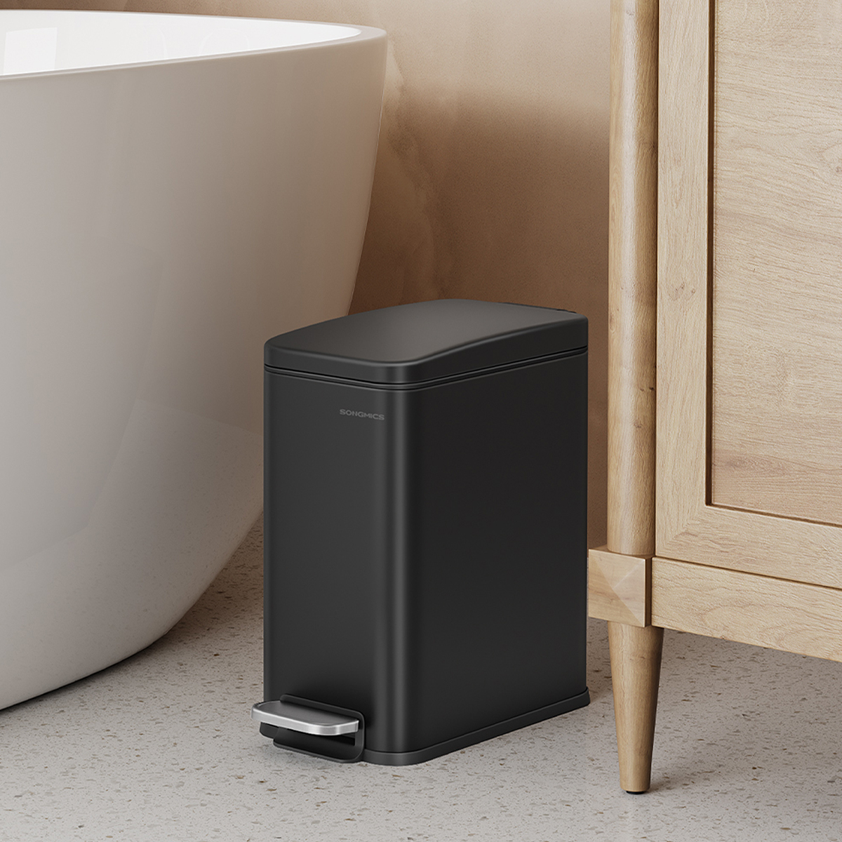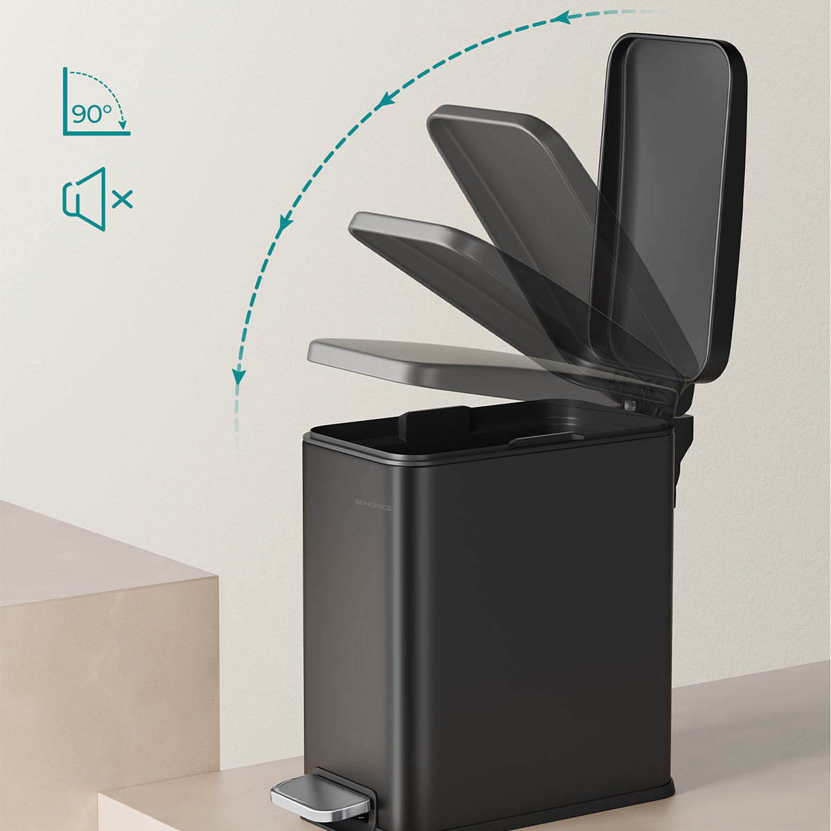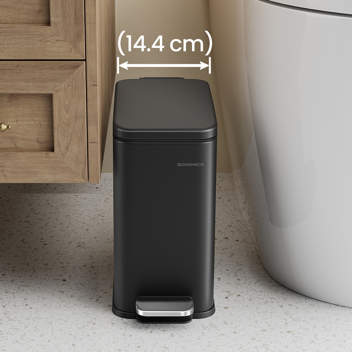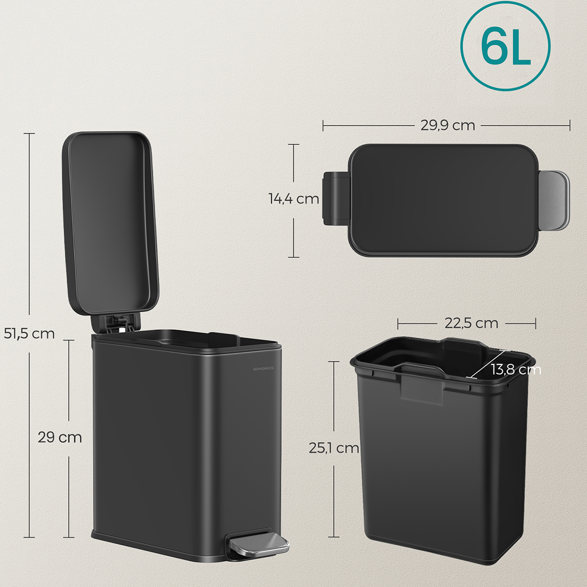 Κάδος απορριμμάτων μπάνιου από την εταιρεία Songmics. Είναι κατασκευασμένος από ανοξείδωτο ατσάλι σε μαύρο χρώμα. Διαθέτει καπάκι το οποίο ανοίγει με ποδοπεντάλ και έχει μηχανισμό soft close, ώστε να κλείνει αργά και αθόρυβα. Το καπάκι ανοίγει 90° μοίρες και σε πλήρη άνοιγμα ο κάδος έχει ύψος 51.5εκ. Εσωτερικά διαθέτει μαύρο πλαστικό δοχείο διαστάσεων 13.8εκ.Μx22.5εκ.Πx25.1εκ.Υ που αφαιρείται εύκολα για να το καθαρίζετε. Χωρητικότητα: 6Lt.