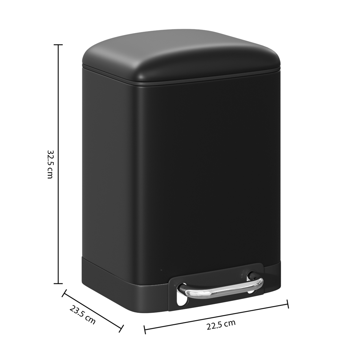 Κάδος απορριμμάτων για το μπάνιο με χωρητικότητα 6 λίτρα. Είναι κατασκευασμένος από μεταλλικό υλικό σε μαύρο χρώμα. Διαθέτει πεντάλ και μηχανισμό soft close για αργό και αθόρυβο κλείσιμο. Στο πίσω μέρος έχει λαβή για εύκολη μεταφορά και εσωτερικά διαθέτει αφαιρούμενο πλαστικό κάδο ώστε να καθαρίζεται εύκολα. Ιδανικός κάδος για κάθε μπάνιο.