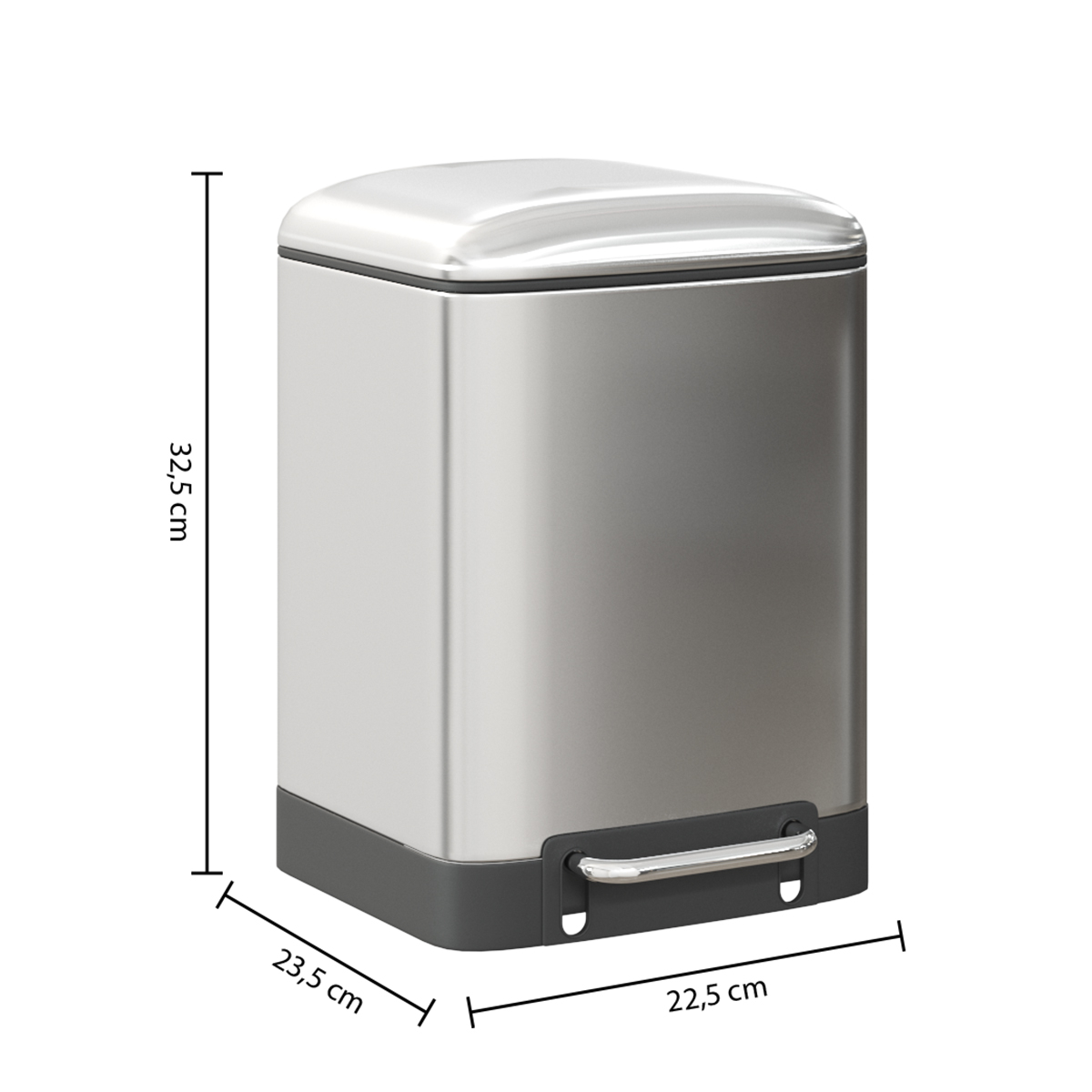 Κάδος απορριμμάτων για το μπάνιο με χωρητικότητα 6 λίτρα. Είναι κατασκευασμένος από ανοξείδωτο ατσάλι σε ασημί χρώμα. Διαθέτει πεντάλ και μηχανισμό soft close για αργό και αθόρυβο κλείσιμο. Στο πίσω μέρος έχει λαβή για εύκολη μεταφορά και εσωτερικά διαθέτει αφαιρούμενο πλαστικό κάδο ώστε να καθαρίζεται εύκολα. Ιδανικός κάδος για κάθε μπάνιο.