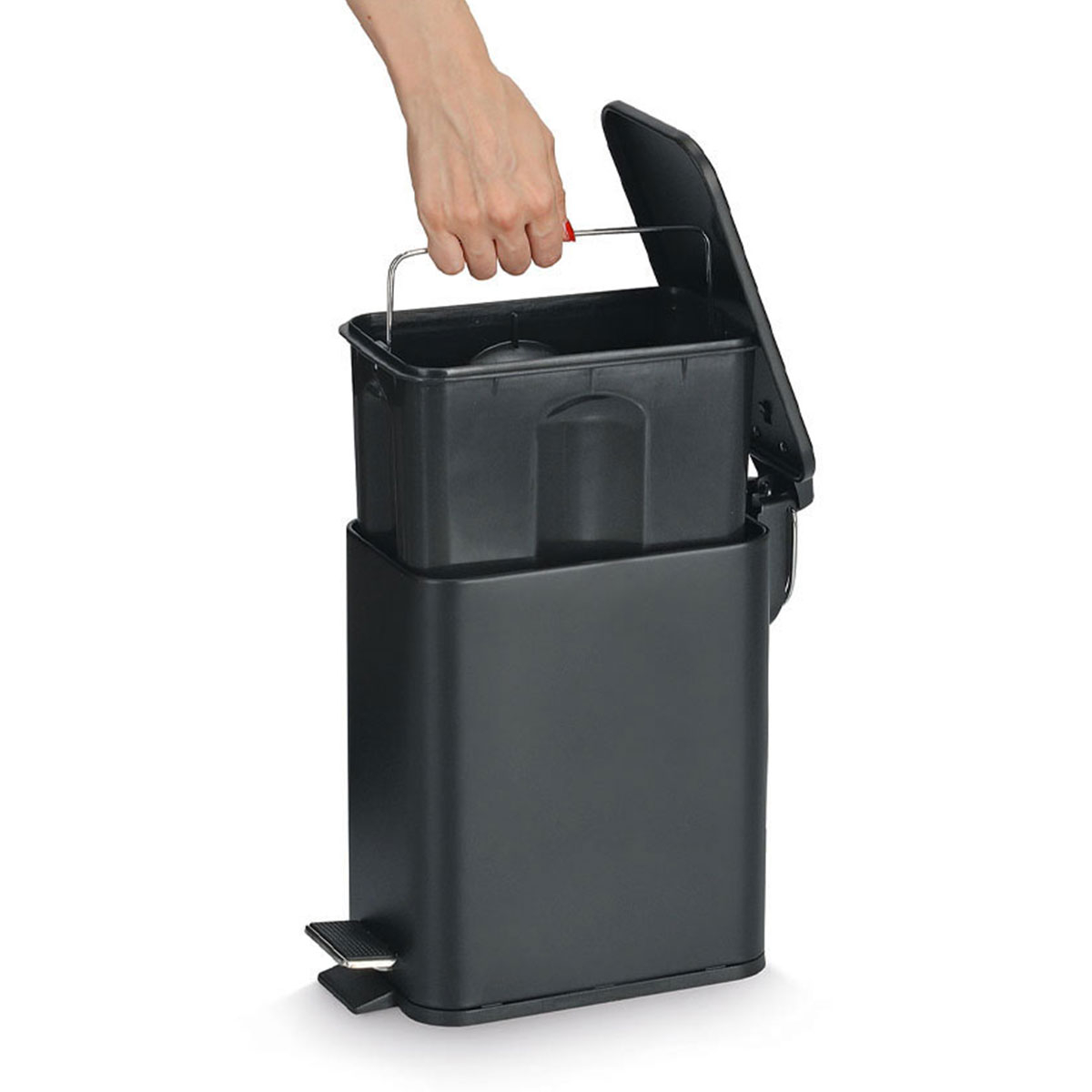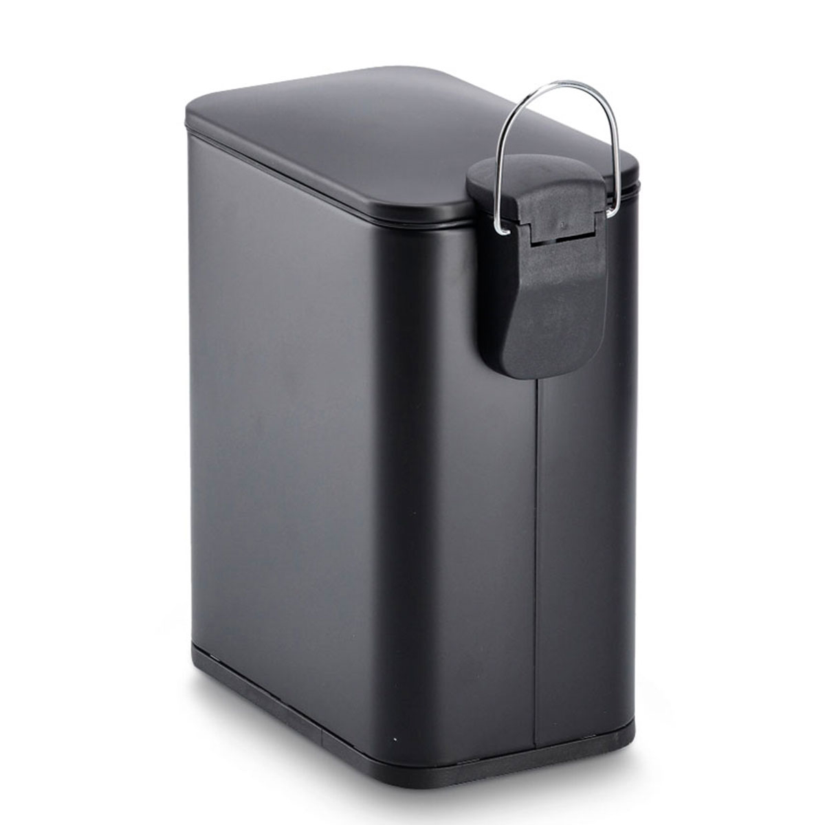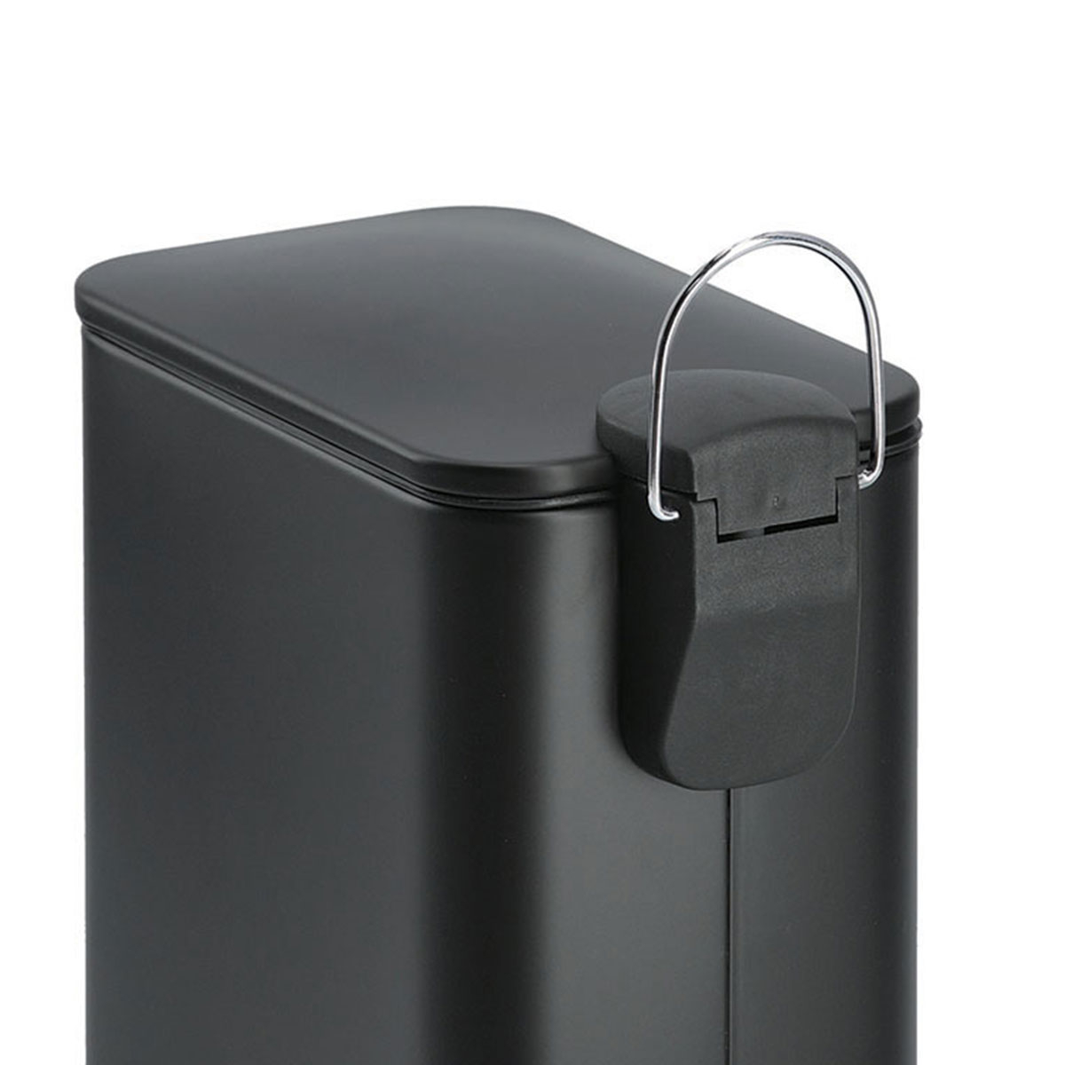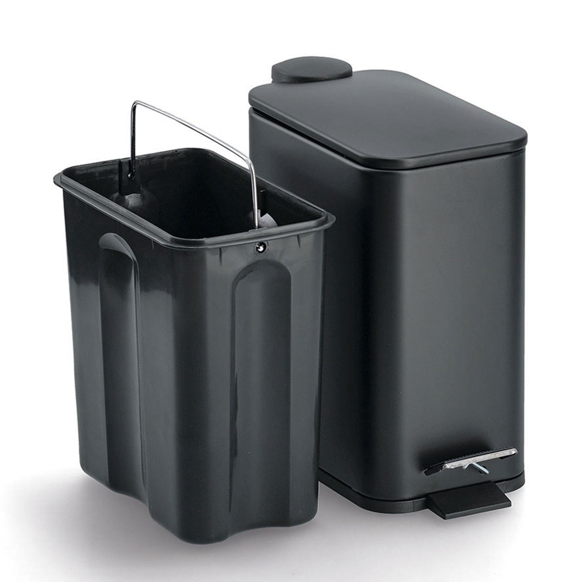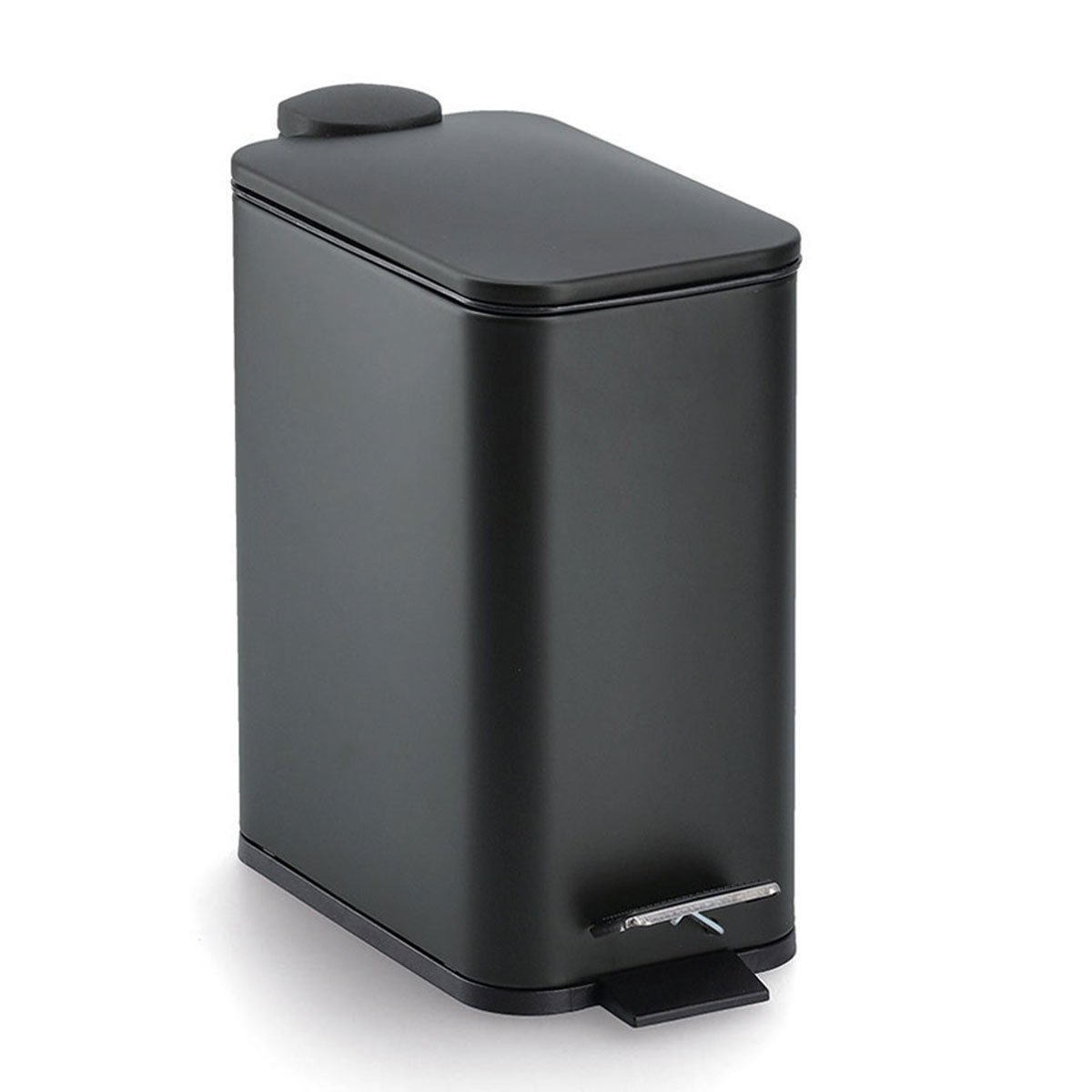Κάδος απορριμμάτων με πεντάλ και μοντέρνα αισθητική. Είναι κατασκευασμένος από μεταλλικό υλικό με ηλεκτροστατική βαφή πούδρας σε μαύρο χρώμα και πλαστικές λεπτομέρειες. Διαθέτει μηχανισμό soft close, ώστε να κλείνει αργά και αθόρυβα καθώς και εσωτερικό πλαστικό κουβά που αφαιρείται εύκολα για να τον καθαρίζετε. Η λιτή του αισθητική ταιριάζει εύκολα σε κάθε διακόσμηση, προσφέροντας μια τακτοποιημένη και καλαίσθητη εικόνα στον χώρο. Μια πρακτική και κομψή επιλογή για κάθε μπάνιο. Χωρητικότητα: 5lt. Συνδυάστε το με τα υπόλοιπα αξεσουάρ του ίδιου σετ για ένα ολοκληρωμένο αποτέλεσμα.