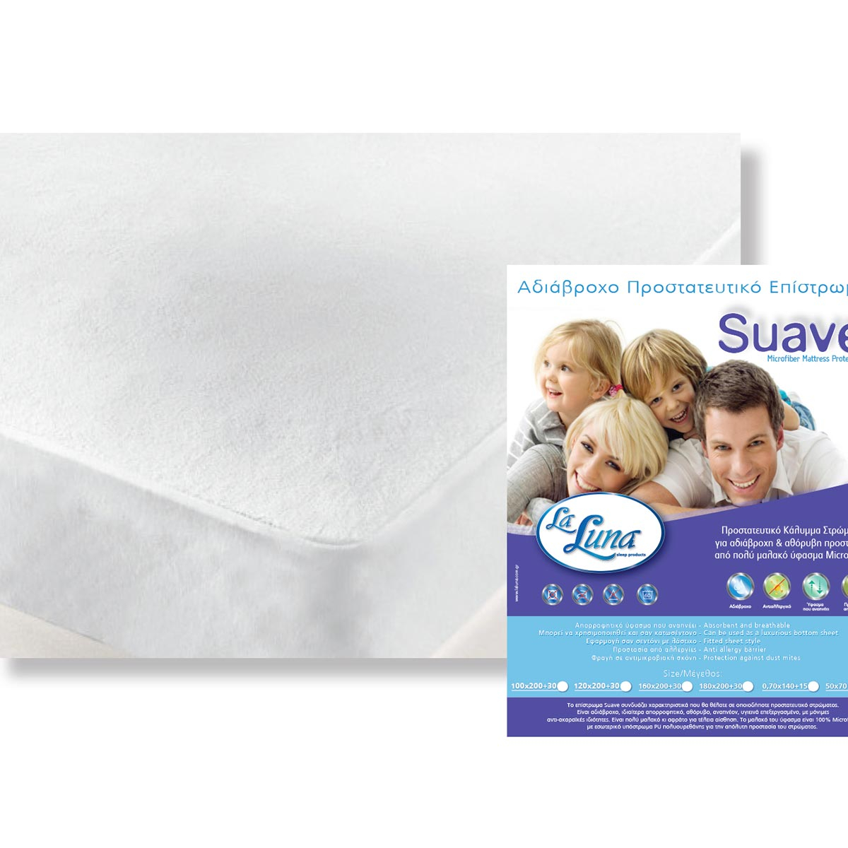 Προστατευτικό αδιάβροχο επίστρωμα από πολύ μαλακό πετσετέ ύφασμα Micro και με υπόστρωμα PU (πολυουρεθάνης) για αδιάβροχη και αθόρυβη προστασία του στρώματος. Είναι πολύ μαλακό και αφράτο με αποτέλεσμα να δίνει τέλεια αίσθηση και να προσφέρει τέλεια εφαρμογή στο στρώμα. Το επίστρωμα Suave συνδυάζει χαρακτηριστικά που θα θέλατε σε οποιοδήποτε προστατευτικό στρώματος. Είναι αδιάβροχο, αθόρυβο, πολύ μαλακό, απορροφητικό, αναπνέον και ειδικά επεξεργασμένο με μόνιμες αντι-ακαραϊκές ιδιότητες. Ελαστική περιμετρική φάσα Jersay 100% πολυέστερ. Εσωτερικό υλικό: Αδιάβροχη μεμβράνη πολυουρεθάνης PU. Εξωτερικό ύφασμα: 100% Micro-πετσετέ.
