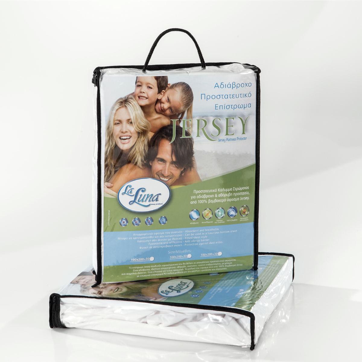 Προστατευτικό αδιάβροχο επίστρωμα από 100% Βαμβακερό ύφασμα Jersey και με υπόστρωμα PU (πολυουρεθάνης) για αδιάβροχη - αθόρυβη προστασία του στρώματος. Είναι ελαστικό και μαλακό με αποτέλεσμα να έχει τέλεια εφαρμογή στο στρώμα και να προσφέρει τέλεια αίσθηση. Το επίστρωμα Jersey συνδυάζει χαρακτηριστικά που θα θέλατε σε οποιοδήποτε προστατευτικό στρώματος. Είναι αδιάβροχο, αθόρυβο, ιδιαίτερα απορροφητικό, αναπνέον, υγιεινά επεξεργασμένο, και με μόνιμες αντι-ακαραϊκές ιδιότητες. Ελαστική περιμετρική φάσα Jersey 100% πολυέστερ. Εσωτερικό υλικό: Αδιάβροχη μεμβράνη πολυουρεθάνης PU. Εξωτερικό ύφασμα: 100% βαμβάκι.