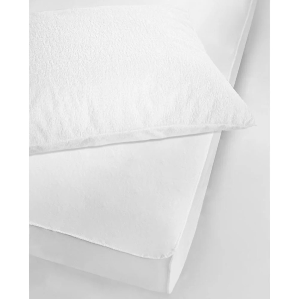 Αδιάβροχο προστατευτικό κάλυμμα στρώματος "Bone Dry" από την εταιρεία La Luna. Η επιφάνεια είναι πετσετέ ύφασμα με σύνθεση 70% βαμβάκι-30% polyester πετσετέ ύφασμα. Η βάση είναι ειδική, πλήρως αδιάβροχη μεμβράνη PU με πόρους που επιτρέπουν στα μόρια του αέρα να την διαπερνούν. Περιμετρικά έχει ελαστική ζέρσεϋ φούστα από polyester.