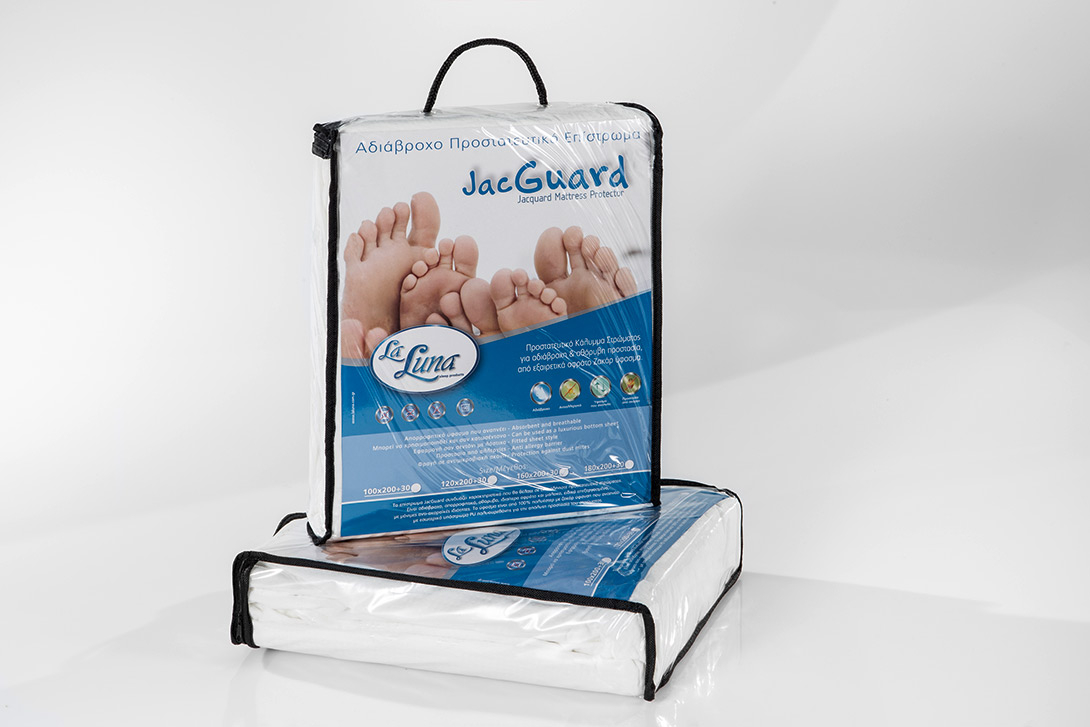 Προστατευτικό αδιάβροχο επίστρωμα από ελαστικό ύφασμα knitted 100% πολυέστερ με ζακάρ ύφανση και με υπόστρωμα PU (πολυουρεθάνης) για αδιάβροχη - αθόρυβη προστασία του στρώματος. Είναι ελαστικό, αφράτο και μαλακό με αποτέλεσμα να έχει τέλεια εφαρμογή στο στρώμα και να προσφέρει τέλεια αίσθηση. Το επίστρωμα Jacquard συνδυάζει χαρακτηριστικά που θα θέλατε σε οποιοδήποτε προστατευτικό στρώματος. Είναι αδιάβροχο, απορροφητικό, αναπνέον, αθόρυβο και ειδικά επεξεργασμένο με μόνιμες αντι-ακαραϊκές ιδιότητες. Ελαστική περιμετρική φάσα Jersay 100% πολυέστερ. Εσωτερικό υλικό: Αδιάβροχη μεμβράνη πολυουρεθάνης PU. Εξωτερικό ύφασμα: 100% πολυέστερ ζακάρ.