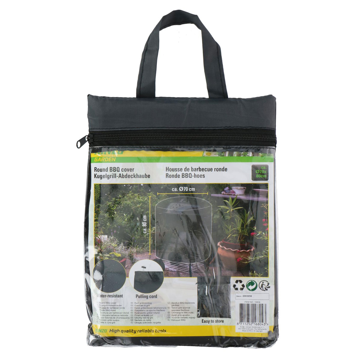 Προστατευτικό κάλυμμα barbeque. Είναι κατασκευασμένο από πολυεστερικό ύφασμα σε μαύρο χρώμα. Ειδικά σχεδιασμένο για στρογγυλά μπάρμπεκιου όπως μπάρμπεκιου βραστήρα. Είναι αδιάβροχο για να προστατεύει τη ψησταριά από νερό της βροχής και την υγρασία. Διαθέτει κορδόνι που σφίγγει για να εφαρμόζει καλύτερα και να εξασφαλίζει ότι θα παραμείνει στη θέση του. Έρχεται σε τσάντα αποθήκευσης.