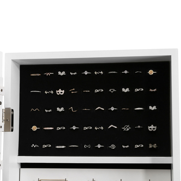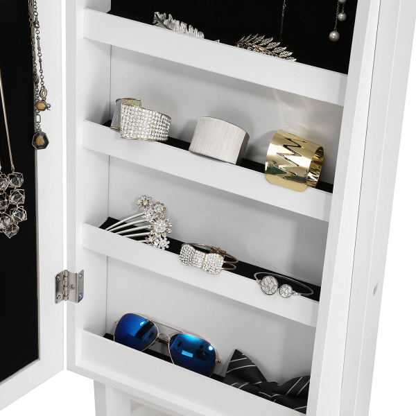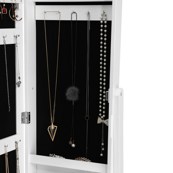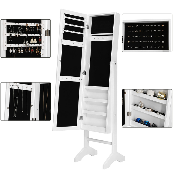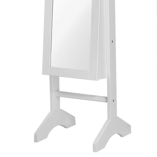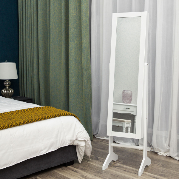 Επιδαπέδιος ολόσωμος καθρέφτης με ενσωματωμένο ντουλάπι κοσμημάτων από την εταιρεία Songmics. Ο σκελετός είναι κατασκευασμένος από ξύλο MDF σε λευκό χρώμα. Μπορείτε να ρυθμίσετε την κλίση του στο σημείο που σας βολεύει. Εσωτερικά διαθέτει κοσμηματοθήκη, επενδυμένη με μαύρο ύφασμα, που προσφέρει θέσεις για κολιέ, σκουλαρίκια, βραχιόλια, καθώς και ράφια για να τακτοποιήσετε τα καλλυντικά σας. Έτσι θα κρατήσετε τακτοποιημένα τα κοσμήματά σας χωρίς χτυπήματα ή γρατζουνιές. *Το προϊόν έρχεται αμοντάριστο και συναρμολογείται βάσει οδηγιών.