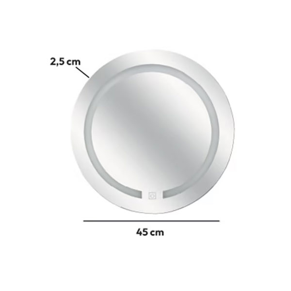 Στρογγυλός καθρέφτης τοίχου με μοντέρνο στυλ. Είναι κατασκευασμένος από ξύλο MDF_E1 σε ασημί χρώμα. Διαθέτει φωτισμό Led ο οποίος ανάβει με διακόπτη αφής ON/OFF. Λειτουργεί με 3 μπαταρίες LR6/AA - 1,5V (δεν συμπεριλαμβάνονται). Ιδανικός καθρέφτης για το μπάνιο σας.