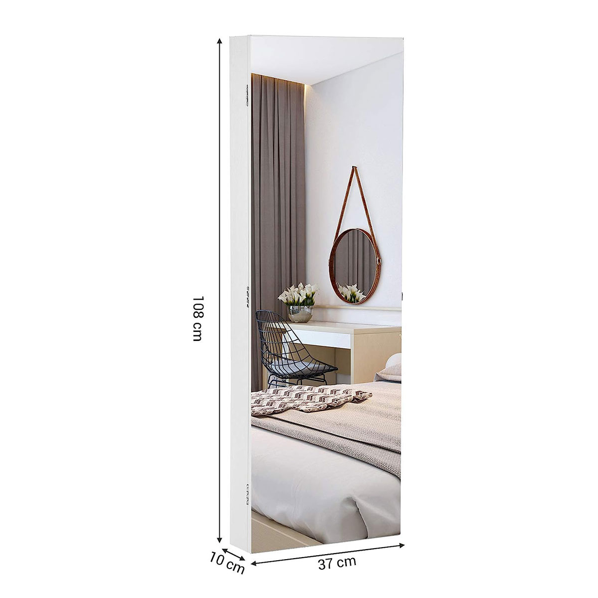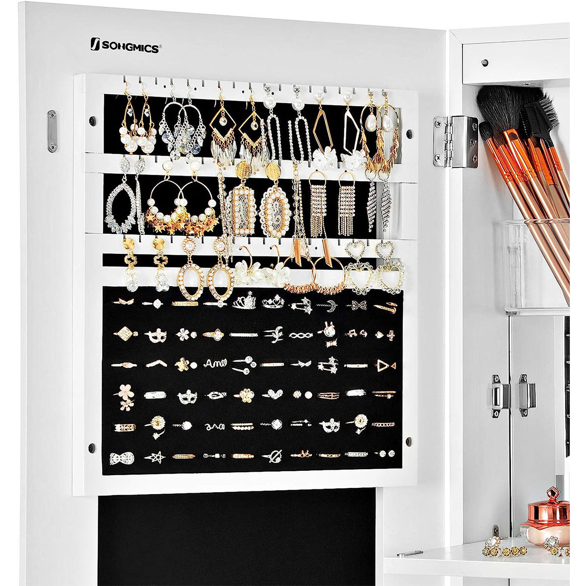 Επιτοίχιος καθρέφτης με ενσωματωμένο ντουλάπι κοσμημάτων από την εταιρεία Songmics. Είναι κατασκευασμένος από ξύλο σε λευκό χρώμα και διαθέτει led φωτισμό. Εσωτερικά έχει κοσμηματοθήκη, επενδυμένη με μαύρο ύφασμα, που προσφέρει θέσεις για κολιέ, σκουλαρίκια, βραχιόλια και ράφια για να τακτοποιήσετε τα καλλυντικά σας. Έτσι θα κρατήσετε τακτοποιημένα τα κοσμήματά σας χωρίς χτυπήματα ή γρατζουνιές. Διαθέτει κλειδαριά για να ασφαλίζει όσο εσείς λείπετε από το σπίτι. Εσωτερικά διαθέτει led τα οποία ανάβουν μόλις ανοίξετε το πορτάκι και λειτουργούν με μπαταρίες ΑΑΑ. Περιέχει 2 γάντζους με τη δυνατότητα να κρεμαστεί στη πόρτα. *Το προϊόν έρχεται αμοντάριστο και συναρμολογείται βάσει οδηγιών.*