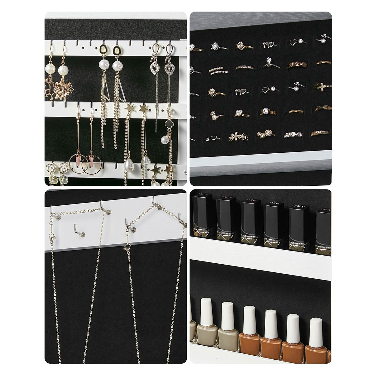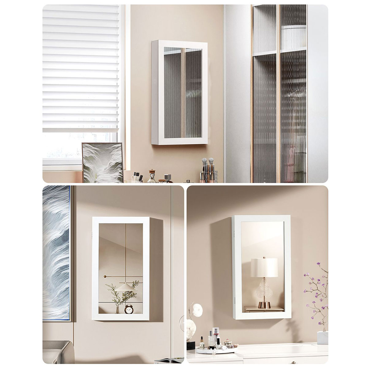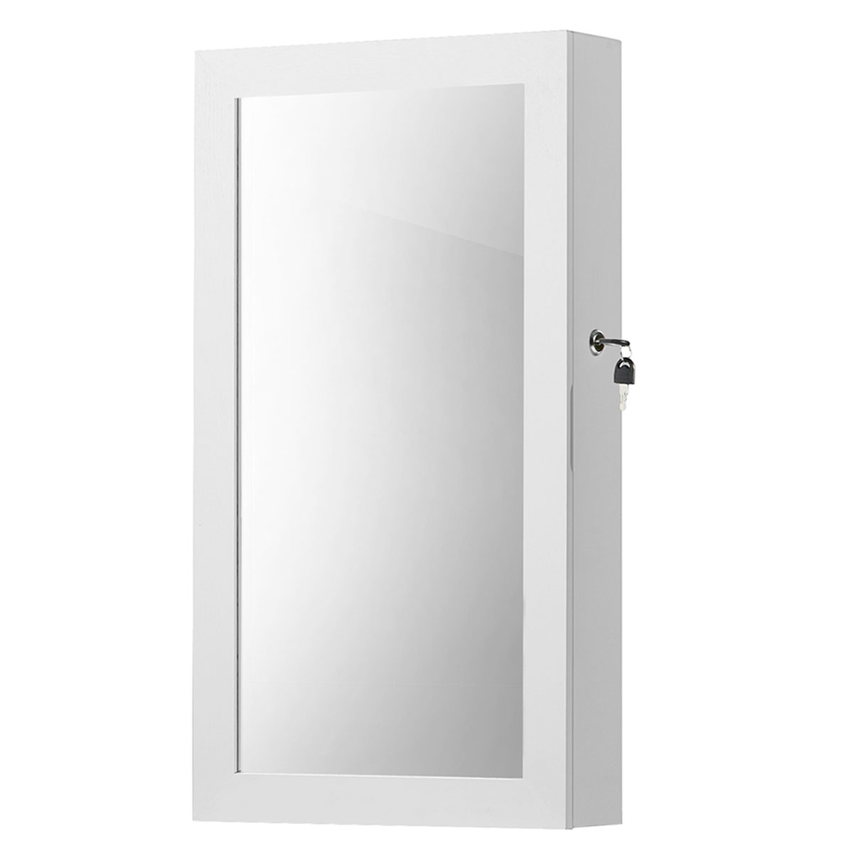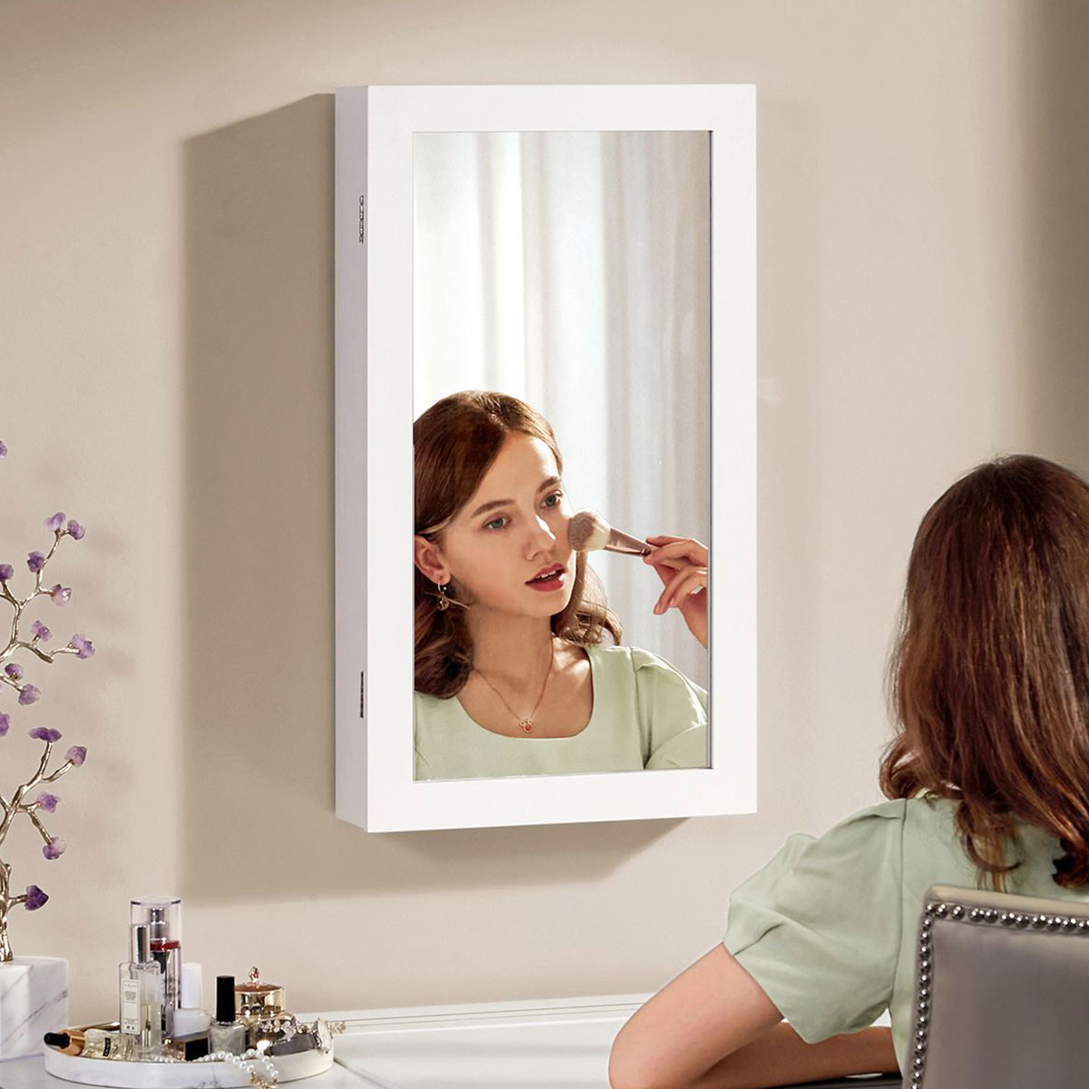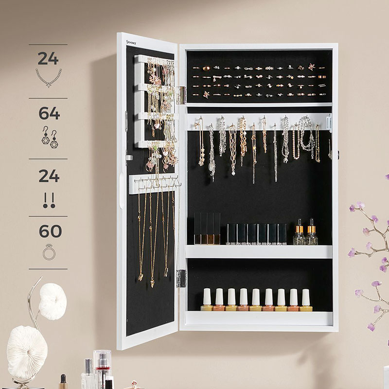 Επιτοίχιος καθρέφτης με ενσωματωμένο ντουλάπι κοσμημάτων από την εταιρεία Songmics. Ο σκελετός είναι κατασκευασμένος από ξύλο MDF σε λευκό χρώμα. Εσωτερικά διαθέτει κοσμηματοθήκη, επενδυμένη με μαύρο βελουτέ ύφασμα, που προσφέρει θέσεις για κολιέ, σκουλαρίκια, βραχιόλια, καλλυντικά κλπ. Πιο συγκεκριμένα χωράει: 24 κολιέ ή βραχιόλια, 60 δαχτυλίδια, 88 ζευγάρια σκουλαρίκια και έχει 2 ραφάκια που μπορείτε να τοποθετήσετε μανό, καλλυντικά ή ό,τι άλλο θέλετε. Ιδανική μπιζουτιέρα για να κρατήσετε τακτοποιημένα τα κοσμήματά σας χωρίς χτυπήματα ή γρατζουνιές. Διαθέτει κλειδάκι για μεγαλύτερη ασφάλεια. Μπορεί να τοποθετηθεί στο σαλόνι ή την κρεβατοκάμαρα πάνω από το μπουντουάρ σας. Διαθέτει εξαρτήματα για εγκατάσταση στο τοίχο (βίδες, ούπα).