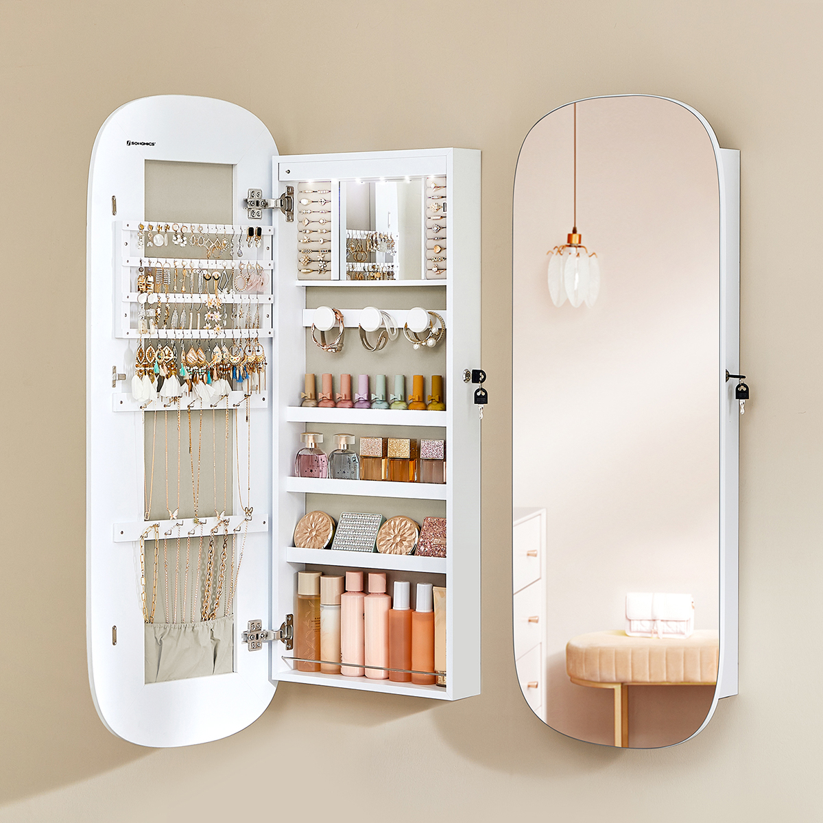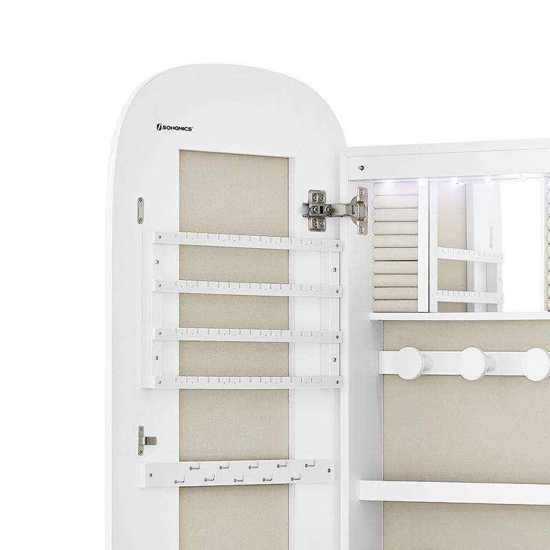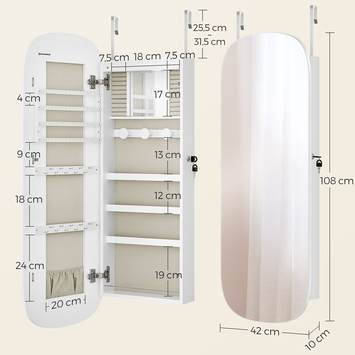 Επιτοίχιος καθρέφτης με ενσωματωμένο ντουλάπι κοσμημάτων από την εταιρεία Songmics. Είναι κατασκευασμένος από ξύλο MDF σε λευκό χρώμα. Εσωτερικά διαθέτει κοσμηματοθήκη, επενδυμένη με εκρού ύφασμα, που προσφέρει θέσεις για κολιέ, σκουλαρίκια, βραχιόλια κα. Έχει ραφάκια για να τακτοποιήσετε τα καλλυντικά σας. Έτσι θα κρατήσετε τακτοποιημένα τα κοσμήματά σας χωρίς χτυπήματα ή γρατζουνιές. Εσωτερικά έχει 6 led φωτάκια που ανοίγουν με διακόπτη. Διαθέτει κλειδαριά για να ασφαλίζει όσο εσείς λείπετε από το σπίτι. Μπορείτε να τη τοποθετήσετε στο τοίχο ή πίσω από την πόρτα με τα άγκιστρα που διαθέτει.*Το προϊόν έρχεται αμοντάριστο και συναρμολογείται βάσει οδηγιών.*