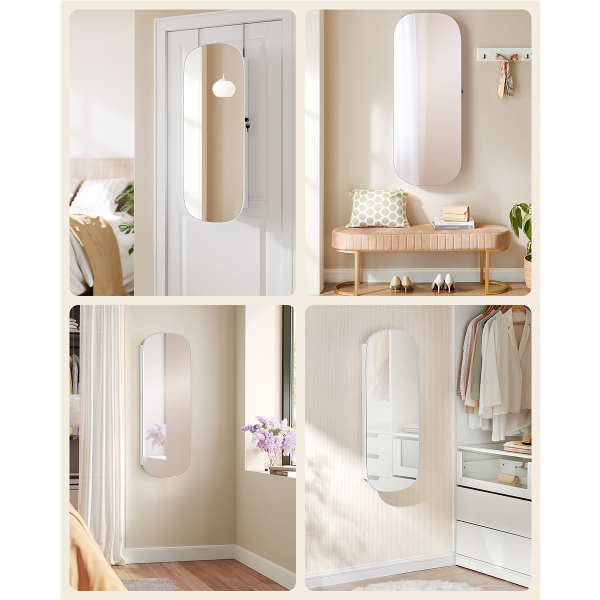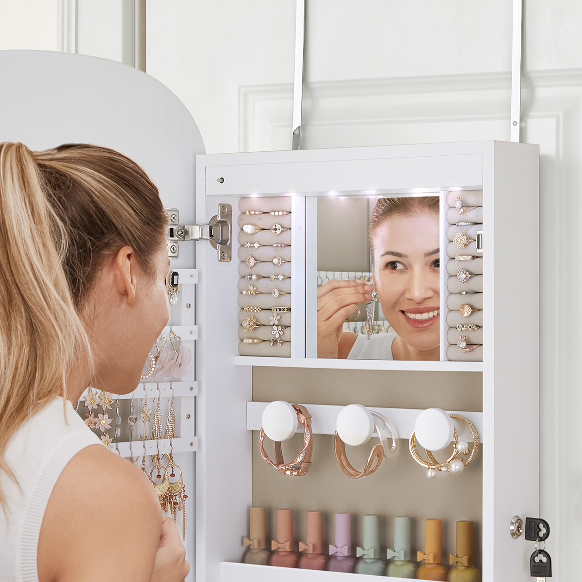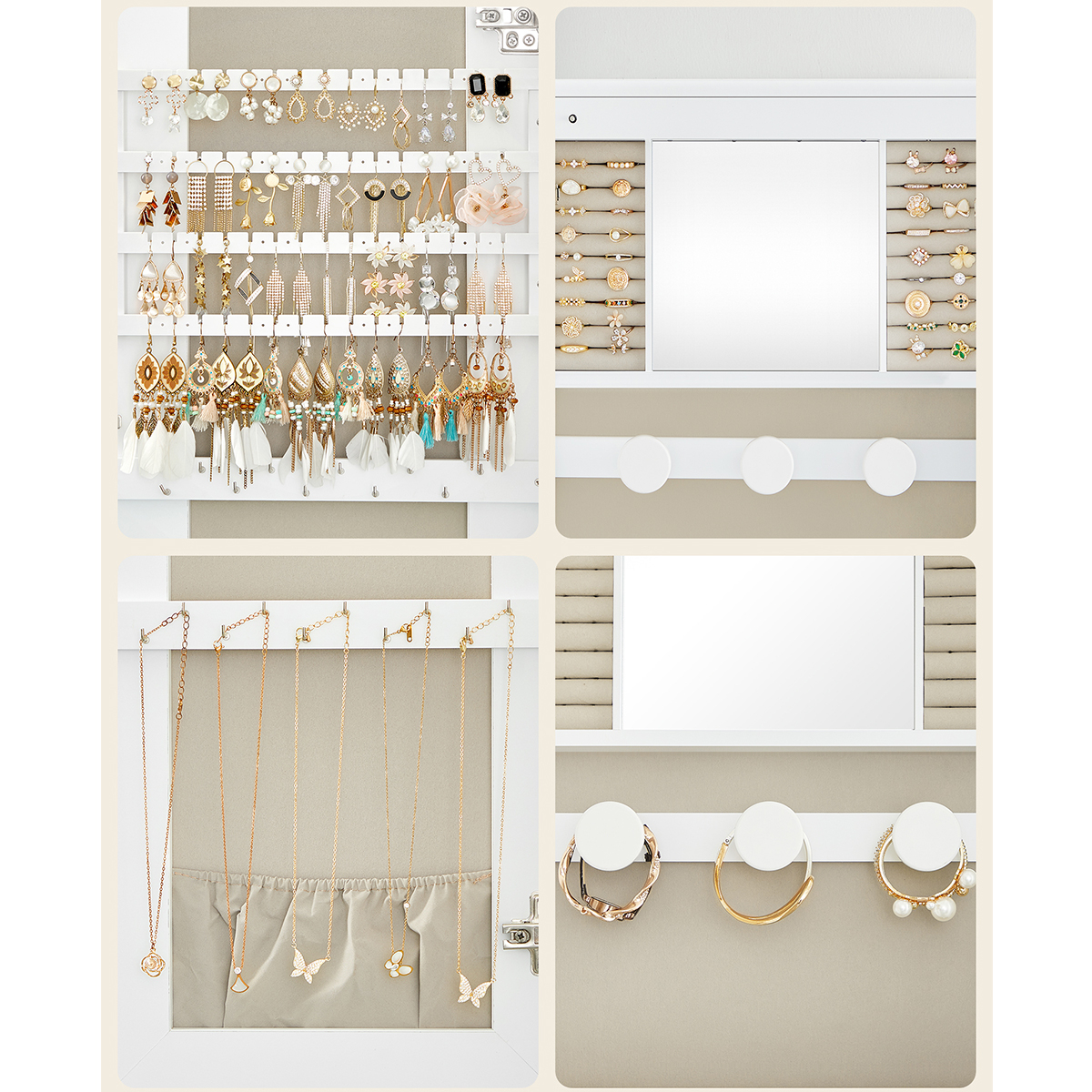 Επιτοίχιος καθρέφτης με ενσωματωμένο ντουλάπι κοσμημάτων από την εταιρεία Songmics. Είναι κατασκευασμένος από ξύλο MDF σε λευκό χρώμα. Εσωτερικά διαθέτει κοσμηματοθήκη, επενδυμένη με εκρού ύφασμα, που προσφέρει θέσεις για κολιέ, σκουλαρίκια, βραχιόλια κα. Έχει ραφάκια για να τακτοποιήσετε τα καλλυντικά σας. Έτσι θα κρατήσετε τακτοποιημένα τα κοσμήματά σας χωρίς χτυπήματα ή γρατζουνιές. Εσωτερικά έχει 6 led φωτάκια που ανοίγουν με διακόπτη. Διαθέτει κλειδαριά για να ασφαλίζει όσο εσείς λείπετε από το σπίτι. Μπορείτε να τη τοποθετήσετε στο τοίχο ή πίσω από την πόρτα με τα άγκιστρα που διαθέτει.*Το προϊόν έρχεται αμοντάριστο και συναρμολογείται βάσει οδηγιών.*