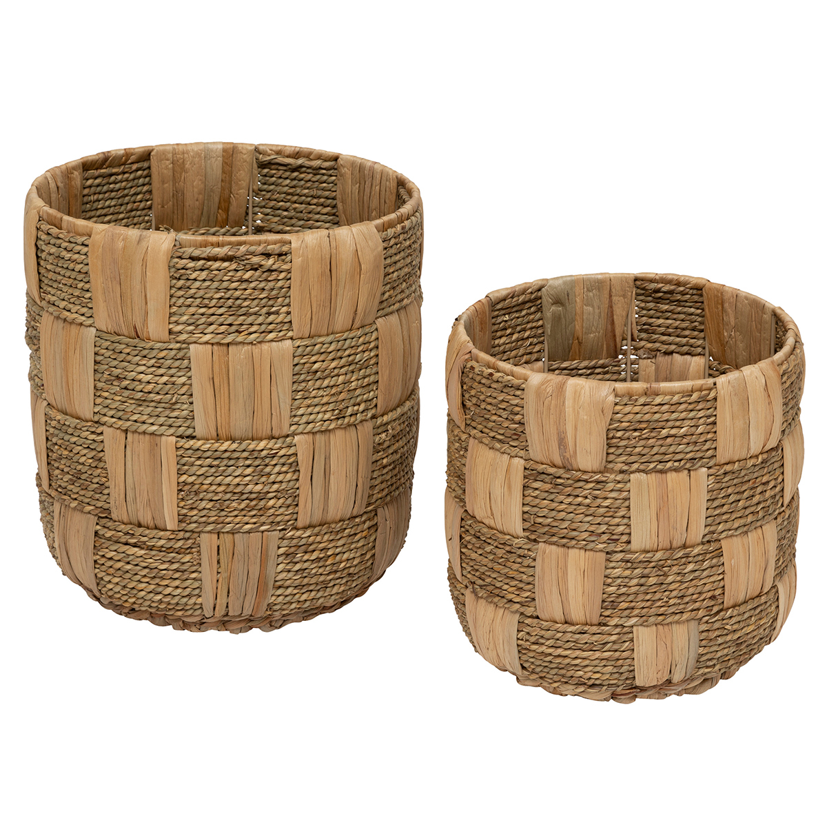 Σετ καλάθια αποθήκευσης με μοντέρνο στυλ. Το σετ περιλαμβάνει 2 καλάθια διαφορετικών μεγεθών, κατασκευασμένα από φυσική ψάθα σε μπεζ χρώμα με μεταλλικό σκελετό. Ιδανικά για να κρατήσουν οργανωμένα τα μικροαντικείμενα, τα περιοδικά και ότι άλλο φανταστείτε, δίνοντας παράλληλα μια φρέσκια ανάσα στο χώρο σας.