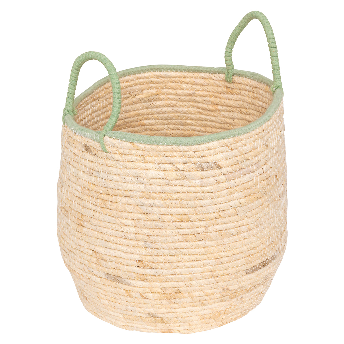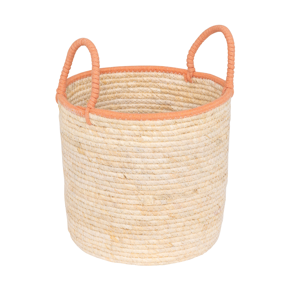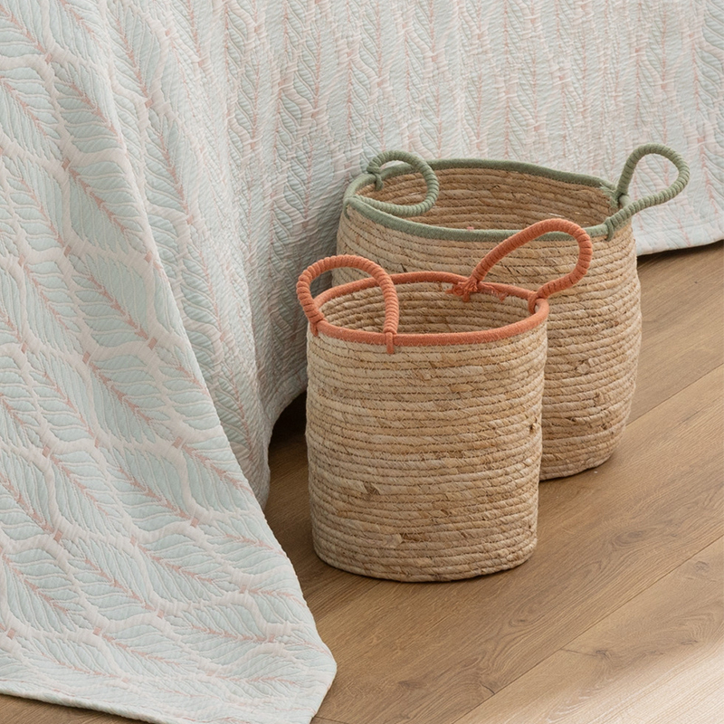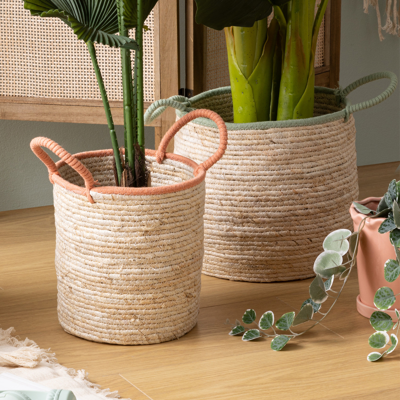 Ψάθινα καλάθια αποθήκευσης με boho αισθητική, σε σετ. Το σετ περιλαμβάνει 2 καλάθια διαφορετικών μεγεθών σε μπεζ χρώμα με σομόν και φιστικί λεπτομέρειες. Διαθέτουν λαβές για εύκολη μεταφορά. Ιδανικά καλάθια για να κρατήσουν οργανωμένα τα μικροαντικείμενα, τα περιοδικά και ότι άλλο φανταστείτε, δίνοντας παράλληλα μια φρέσκια ανάσα στο χώρο σας. Συνδυάστε τα με τα υπόλοιπα προϊόντα της ίδιας συλλογής για ένα ολοκληρωμένο αποτέλεσμα στο χώρο σας.