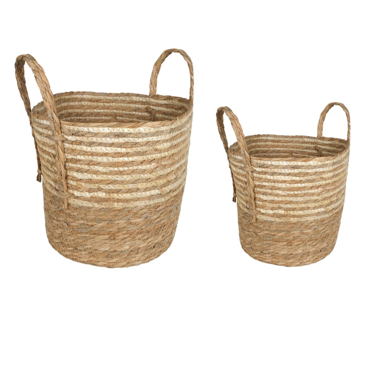 Καλάθια σετ από την εταιρεία Espiel σε μπεζ χρώμα με μοντέρνο σχεδιασμό. Είναι κατασκευασμένα από ψάθα. Διαθέτουν χερούλια για εύκολη μεταφορά. Ιδανικά για να κρατήσετε οργανωμένα τα αντικείμενά σας. Θα σας φανούν πρακτικά και απαραίτητα στο χωλ για τα κλειδιά και την αλληλογραφία, στο δωμάτιο για τα κοσμήματα, στο μπάνιο για τις χτένες, ή για οποιαδήποτε άλλη χρήση επιθυμείτε.