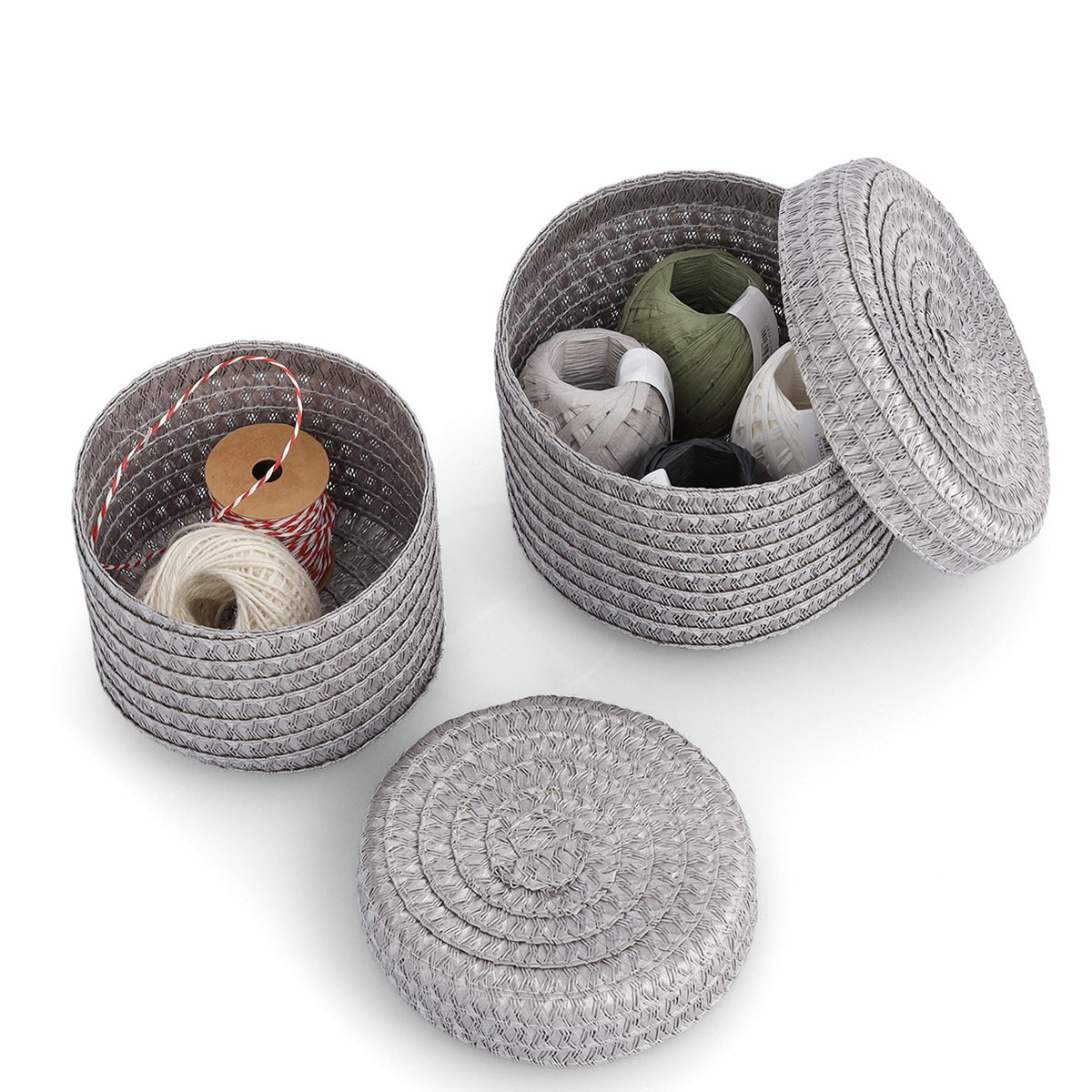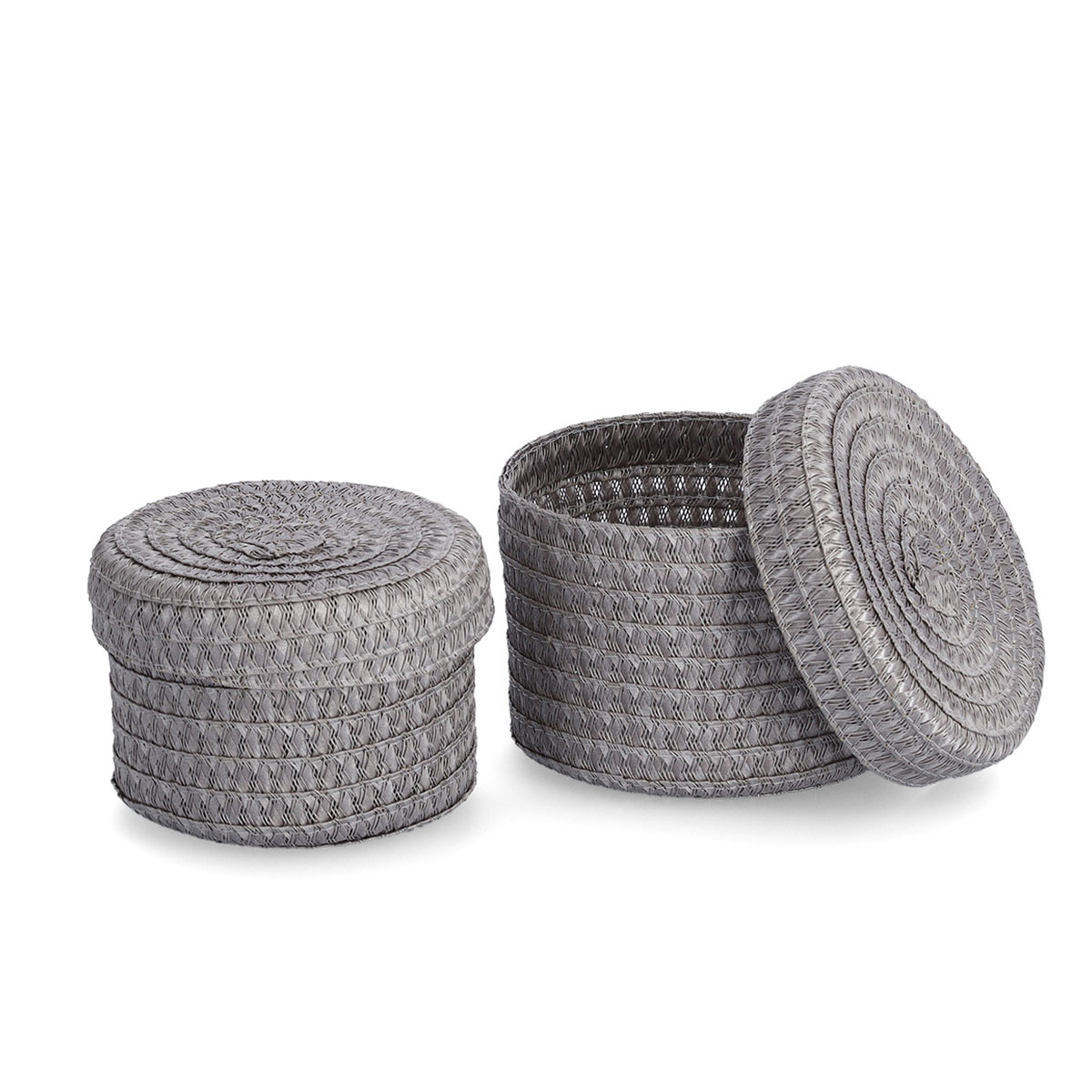 Καλάθια αποθήκευσης σε σετ 2 τεμαχίων με μίνιμαλ ύφος. Είναι κατασκευασμένα από πλαστικό υλικό (πολυπροπυλένιο) σε όψη ψάθας σε γκρι χρώμα. Το σετ περιλαμβάνει 2 καλάθια με καπάκι, διαφορετικών διαστάσεων. Ιδανικά για το καθιστικό, το μπάνιο, το υπνοδωμάτιο ή οποιοδήποτε άλλο χώρο του σπιτιού έχει μικροπράγματα για τακτοποίηση.