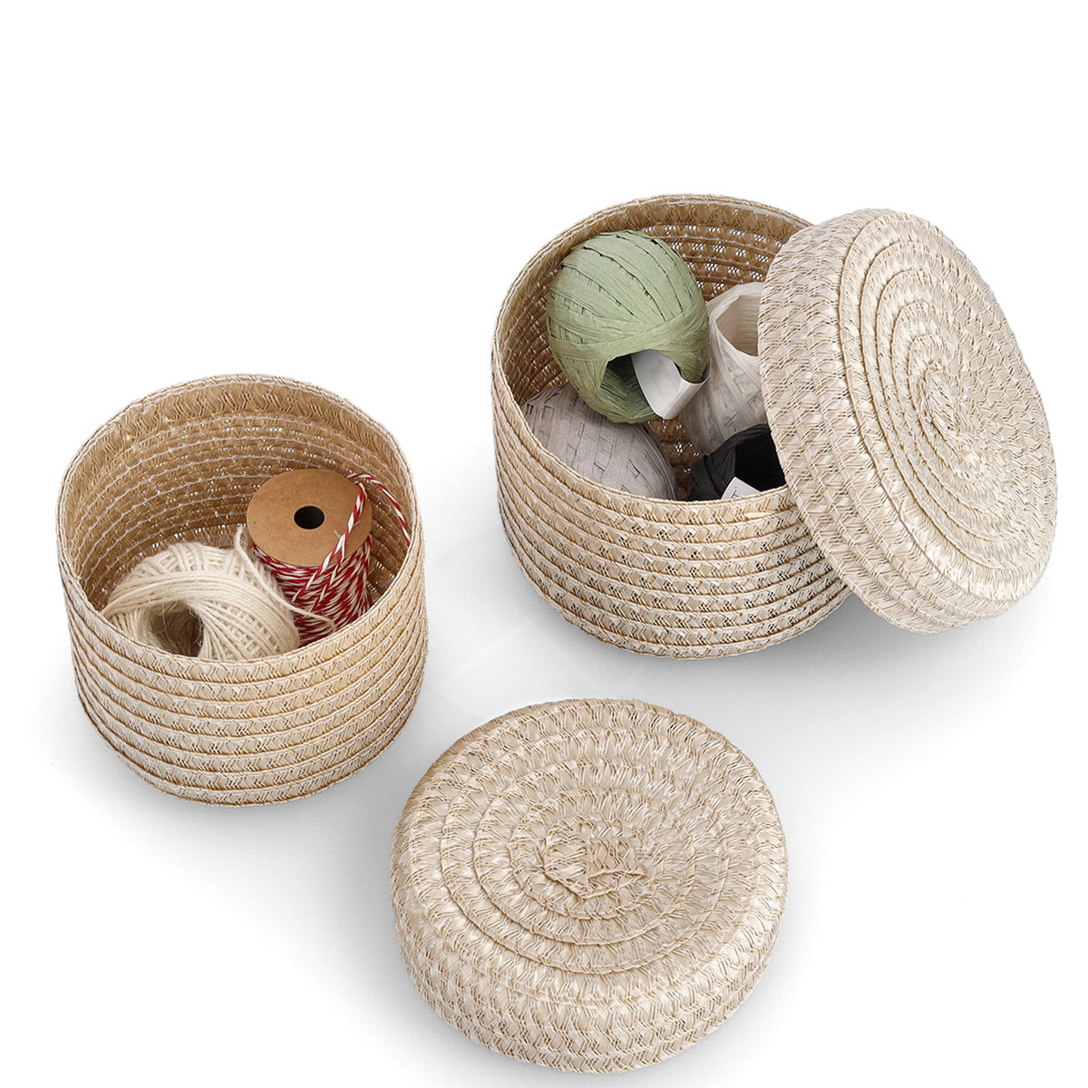 Καλάθια αποθήκευσης σε σετ 2 τεμαχίων με μίνιμαλ ύφος. Είναι κατασκευασμένα από πλαστικό υλικό (πολυπροπυλένιο) σε όψη ψάθας σε μπεζ χρώμα. Το σετ περιλαμβάνει 2 καλάθια με καπάκι, διαφορετικών διαστάσεων. Ιδανικά για το καθιστικό, το μπάνιο, το υπνοδωμάτιο ή οποιοδήποτε άλλο χώρο του σπιτιού έχει μικροπράγματα για τακτοποίηση.
