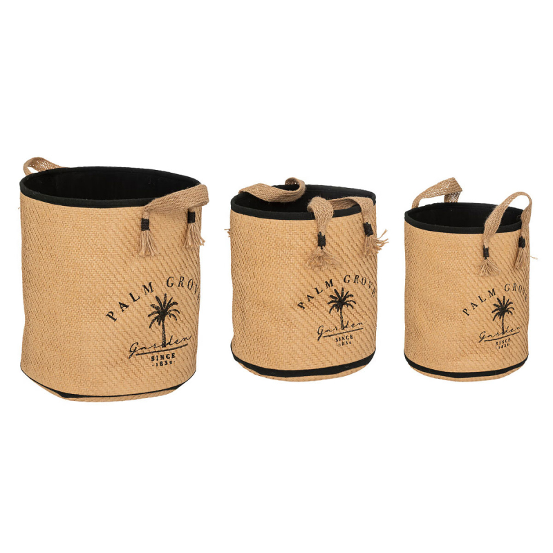 Καλάθια αποθήκευσης σε φυσική απόχρωση με μαύρες λεπτομέρειες και μοντέρνο σχέδιο. Είναι ψάθινα, με λαβές από γιούτα και εσωτερικά διαθέτουν μαύρη υφασμάτινη επένδυση από polyester. Το σετ αποτελείται από 3 τεμάχια σε διάφορες διαστάσεις. Ιδανικά για να κρατήσουν οργανωμένα τα μικροαντικείμενα, τα περιοδικά και ότι άλλο φανταστείτε, δίνοντας παράλληλα μια φρέσκια ανάσα στο χώρο σας.