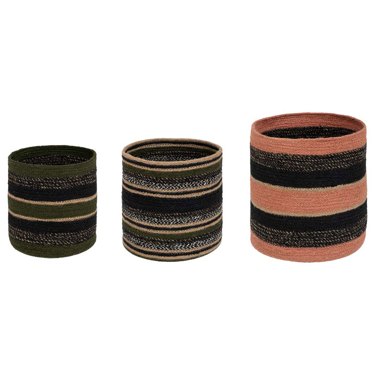 Σετ ψάθινα καλάθια αποθήκευσης με μοντέρνο ύφος και ριγέ σχέδιο. Το σετ περιλαμβάνει 3 καλάθια διαφορετικών μεγεθών, κατασκευασμένα από φυσική ψάθα σε μπεζ, σομόν, χακί κα μαύρο χρώμα. Ιδανικά για να κρατήσουν οργανωμένα τα μικροαντικείμενα, τα περιοδικά και ότι άλλο φανταστείτε, δίνοντας παράλληλα μια φρέσκια ανάσα στο χώρο σας.