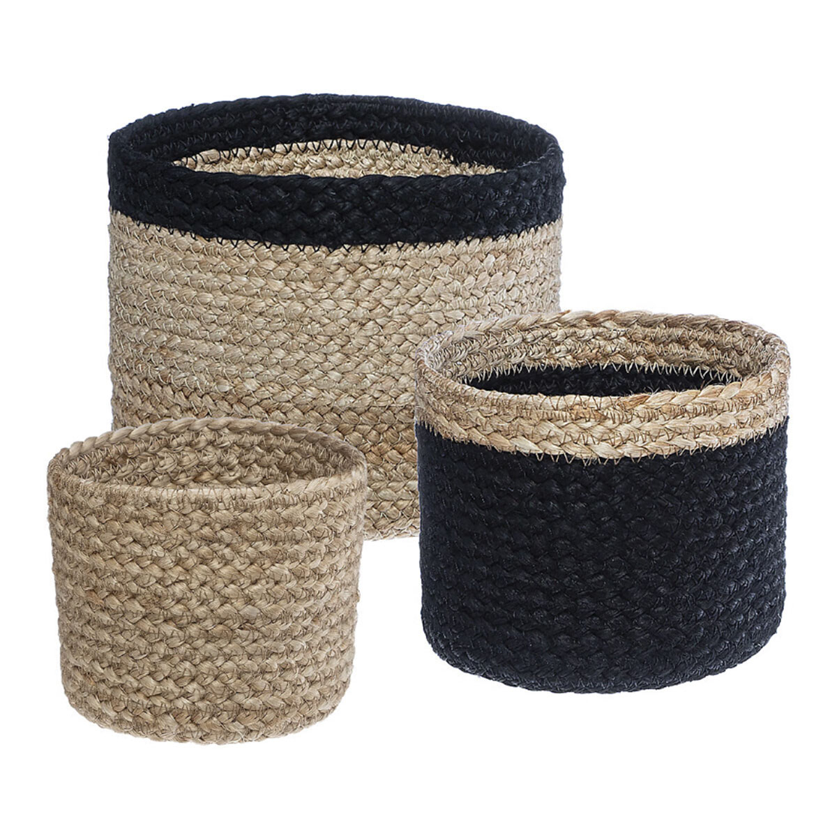 Σετ ψάθινα καλάθια αποθήκευσης σε μπεζ απόχρωση με μαύρες λεπτομέρειες. Ιδανικά για να κρατήσουν οργανωμένα τα μικροαντικείμενα, τα περιοδικά και ότι άλλο φανταστείτε, δίνοντας παράλληλα μια φρέσκια ανάσα στο χώρο σας.
