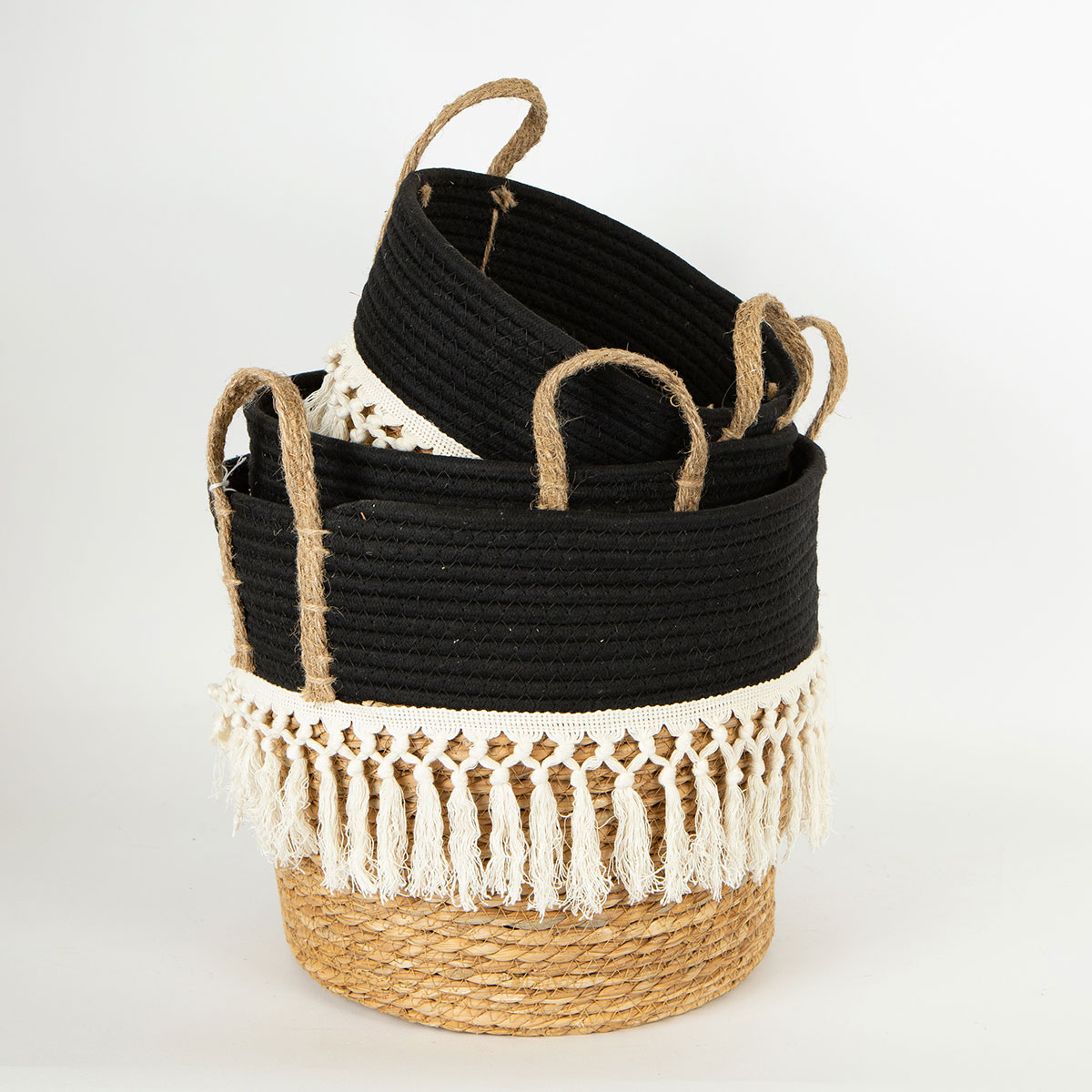 Σετ καλάθια αποθήκευσης της εταιρείας Estheti σε μαύρο-μπεζ χρώμα με έθνικ σχέδιο. Είναι κατασκευασμένα από ψάθα. Διαθέτουν χερούλια για εύκολη μεταφορά και διακοσμητικά κρόσσια. Ιδανικά για να κρατήσουν οργανωμένα τα μικροαντικείμενα, τα περιοδικά και ότι άλλο φανταστείτε, δίνοντας παράλληλα μια φρέσκια ανάσα στο χώρο σας.