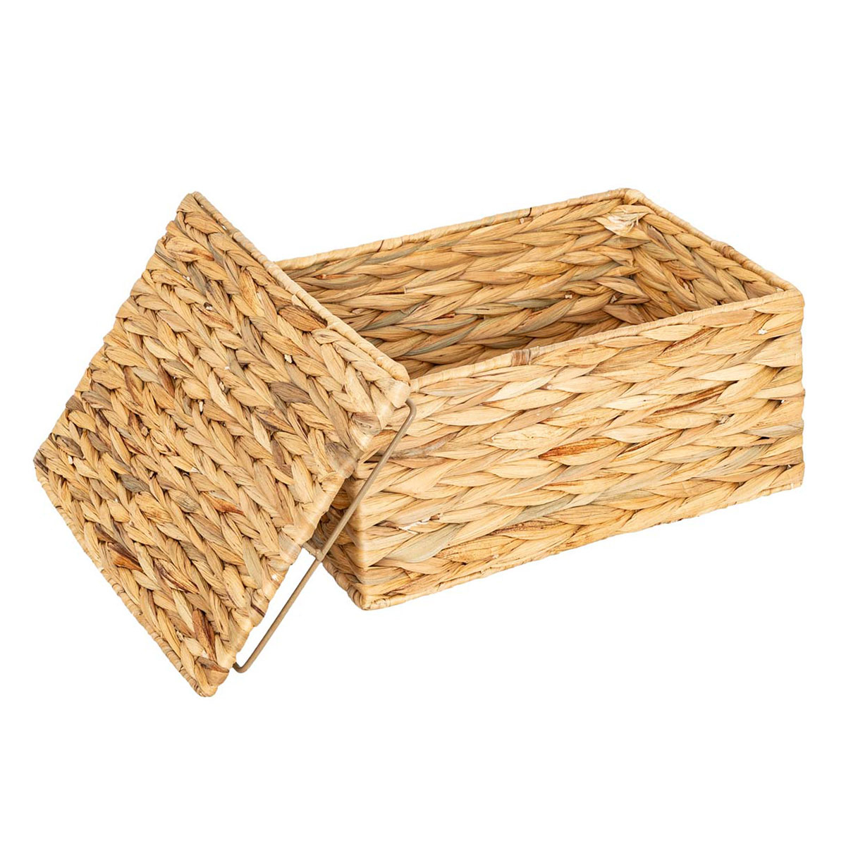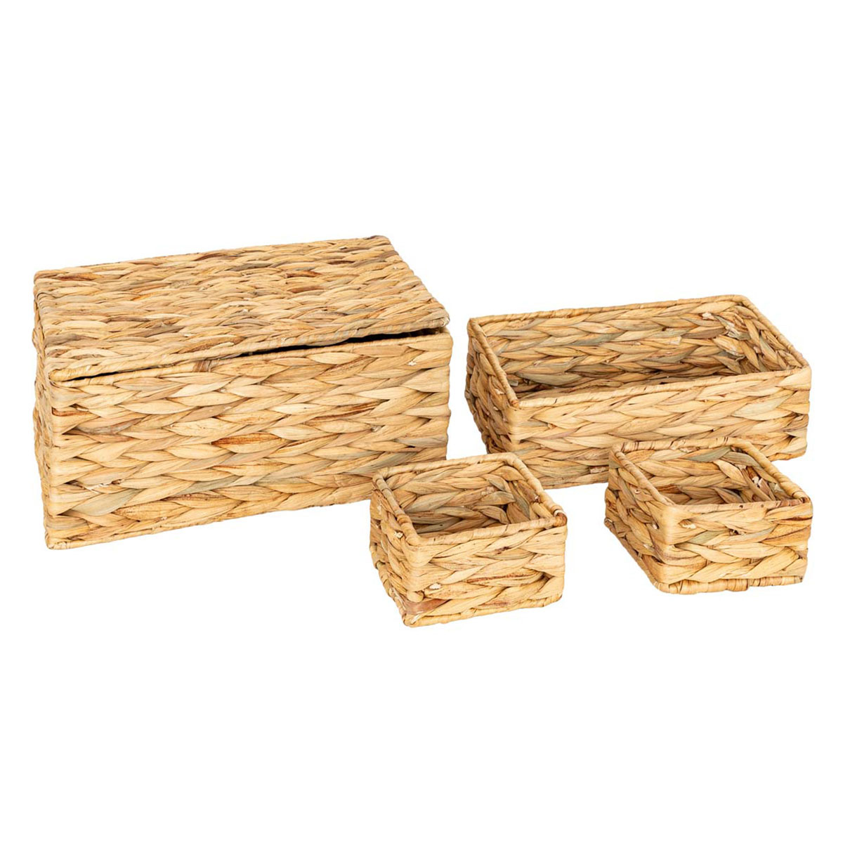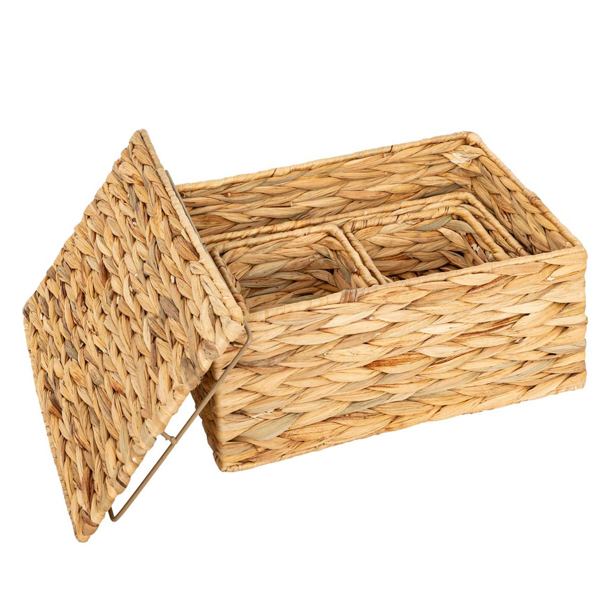 Σετ ψάθινα καλάθια αποθήκευσης με μίνιμαλ ύφος. Το σετ περιλαμβάνει 4 καλάθια διαφορετικών μεγεθών εκ των οποίων το 1 έχει καπάκι. Είναι κατασκευασμένα από φυσική ψάθα υδρουάκινθου με μεταλλικό σκελετό για να στέκονται. Ιδανικά για να κρατήσουν οργανωμένα τα μικροαντικείμενα, τα περιοδικά και ότι άλλο φανταστείτε, δίνοντας παράλληλα μια φρέσκια ανάσα στο χώρο σας.