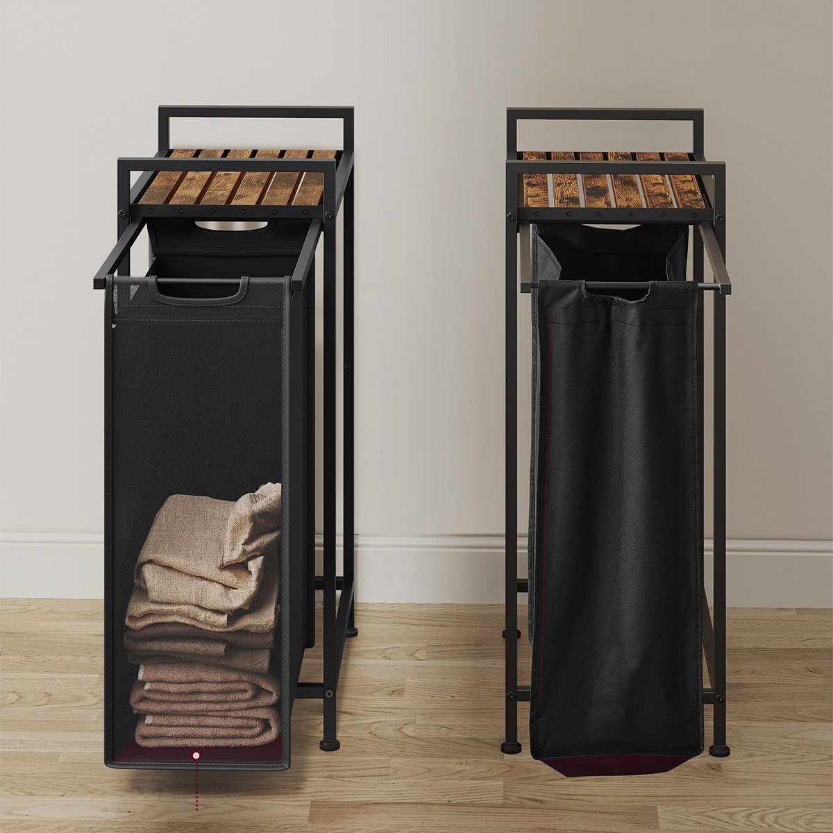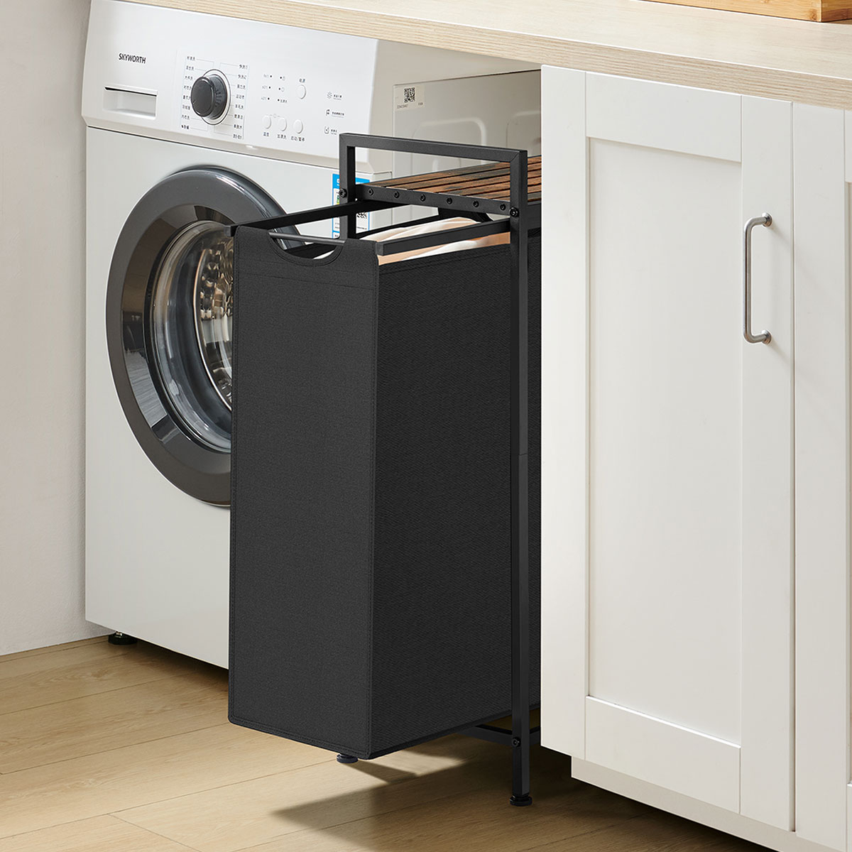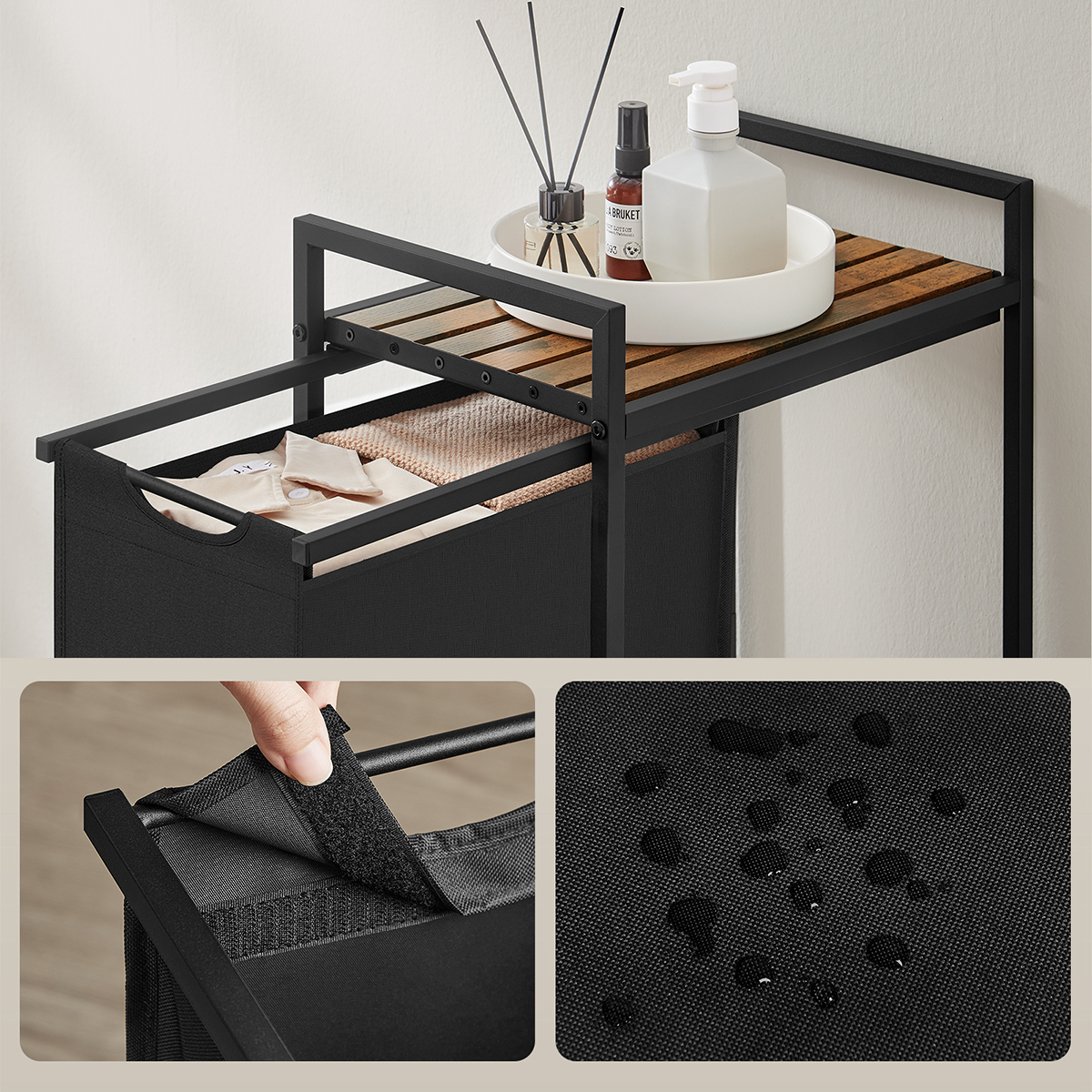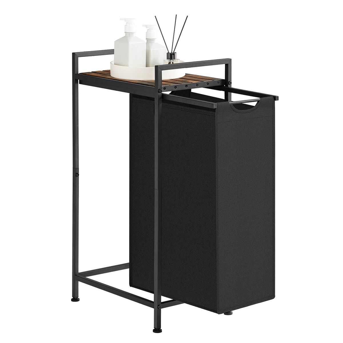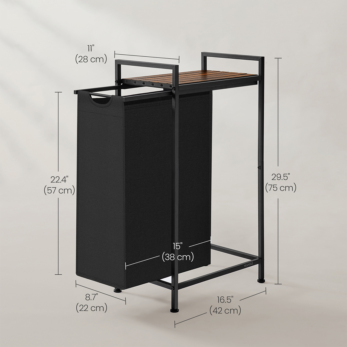 Έπιπλο μπάνιου με καλάθι απλύτων και μοντέρνο σχεδιασμό από την εταιρεία Vasagle. Ο σκελετός είναι κατασκευασμένος από ατσάλι σε μαύρο χρώμα, ενώ ο πάγκος από ξύλο MDF σε καφέ χρώμα. Διαθέτει 1 συρταρωτό μαύρο καλάθι από ύφασμα non-woven που έχει πάτο από πλαστικό υλικό για να μην τσαλακώνει. Το καλάθι είναι αποσπώμενο για να μπορείτε να το μεταφέρετε κοντά στο πλυντήριο και είναι τοποθετημένο με αυτοκόλλητο velcro για να αφαιρείται εύκολα και να πλένεται. Ιδανικό και πρακτικό βοηθητικό έπιπλο μπάνιου για να οργανώσετε τον χώρο σας και ταυτόχρονα να δώσετε μια μοντέρνα πινελιά. Μέγιστο βάρος αντοχής πάγκου: 10kg. *Το προϊόν έρχεται αμοντάριστο και συναρμολογείται βάσει οδηγιών.*