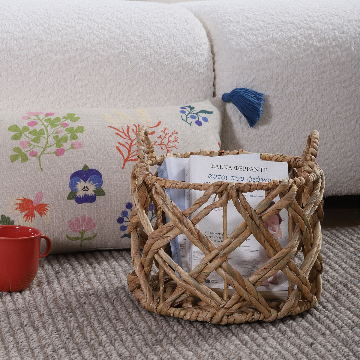 Καλάθι αποθήκευσης από την εταιρεία Nef-Nef σε φυσικό μπεζ χρώμα με περίτεχνο σχέδιο. Είναι ψάθινο κατασκευασμένο από υάκινθο νερού, ένα φυσικό υλικό που προσδίδει ιδιαίτερη αισθητική. Μπορείτε ακόμη να το χρησιμοποιήσετε και στην οργάνωση μπάνιου ή σαν διακοσμητικό στοιχείο.