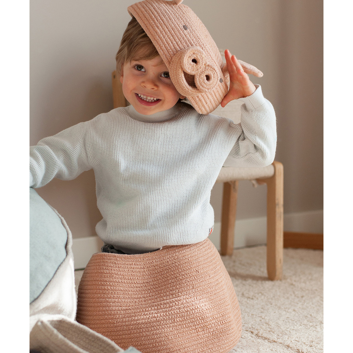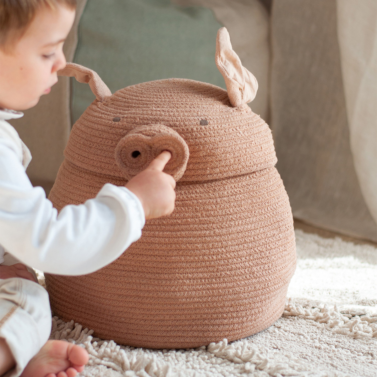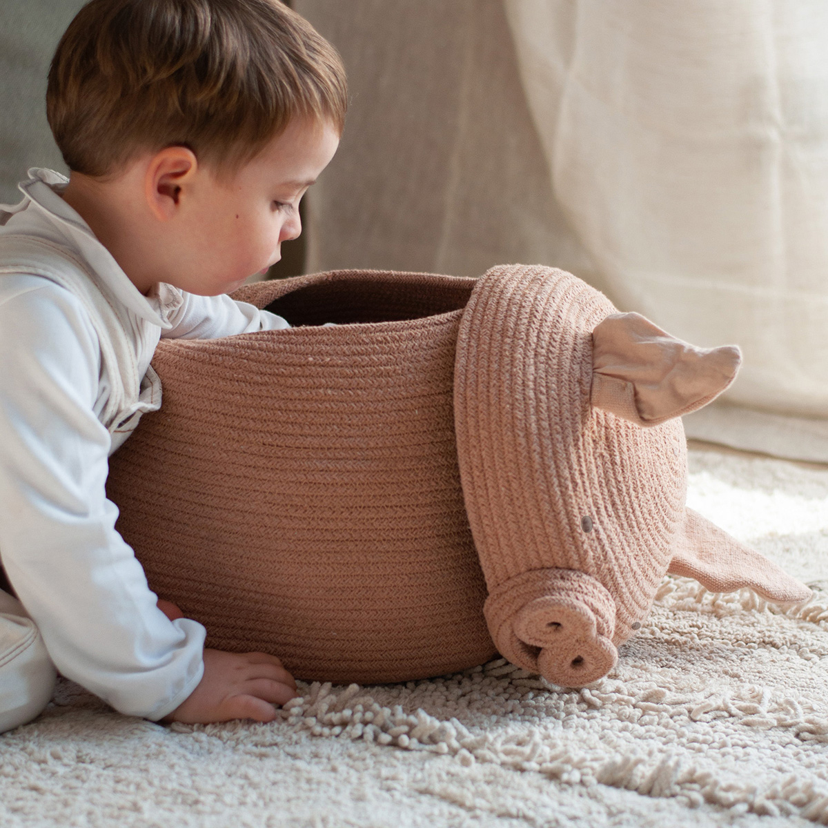 Χειροποίητο καλάθι αποθήκευσης μεγάλο, από την εταιρεία Lorena Canals. Με σχέδιο γουρουνάκι σε ροζ απόχρωση. Είναι κατασκευασμένο από 67% βαμβάκι και 33% ίνες polyester από ανακυκλωμένα μπουκάλια. Ιδανικό για το παιδικό και βρεφικό δωμάτιο καθώς μπορείτε να βάλετε βιβλία, παιχνίδια και μικροπράγματα όλων των ειδών. Είναι χειροποίητο και κάθε κομμάτι είναι μοναδικό, επομένως μπορεί να υπάρχουν μικρές παραλλαγές στο σχήμα και στο χρώμα τους. Το προϊόν πληροί όλες τις προδιαγραφές ποιότητας και ασφάλειας για παιδιά, ενώ έχει ISO 9001, ISO 14001 & ISO 18001.