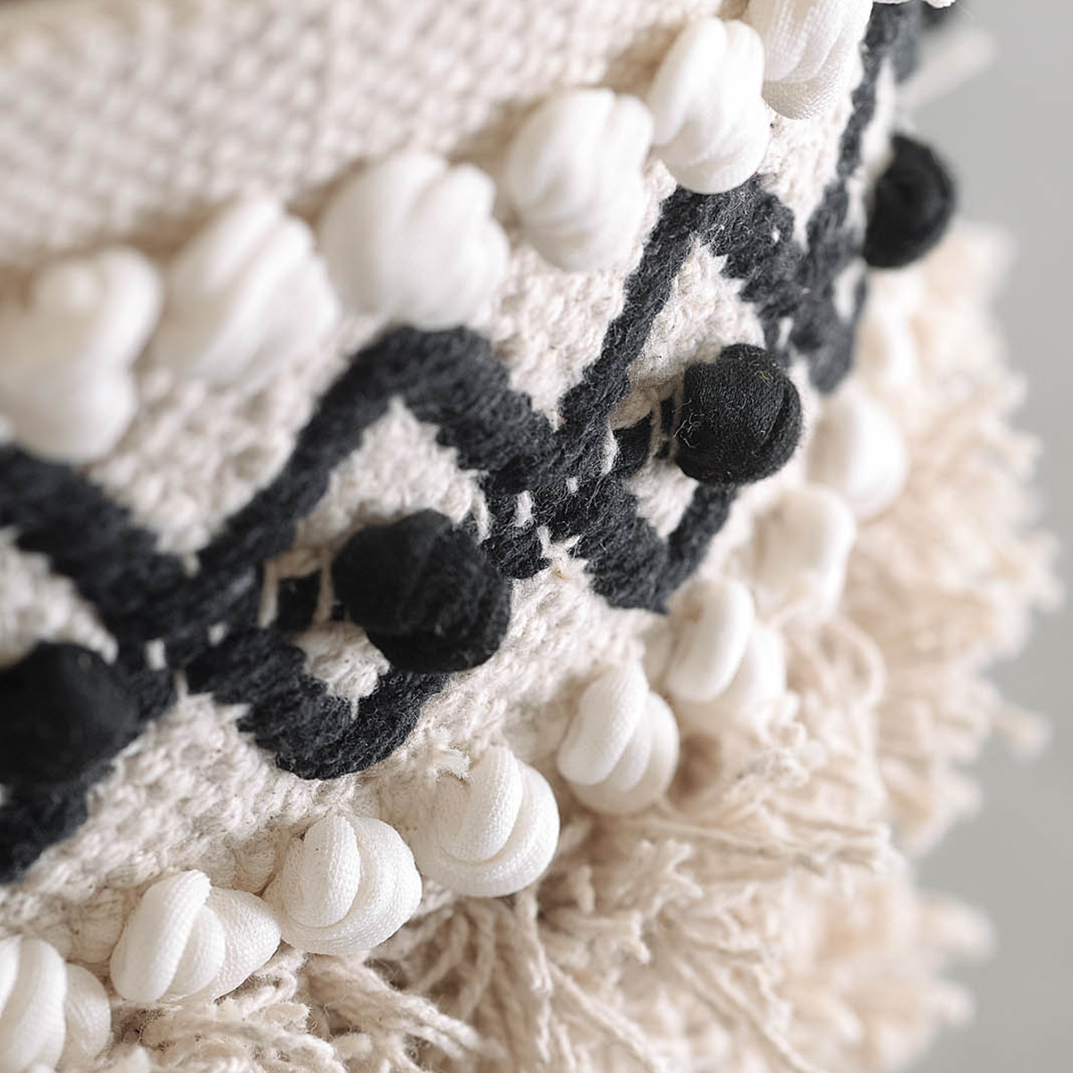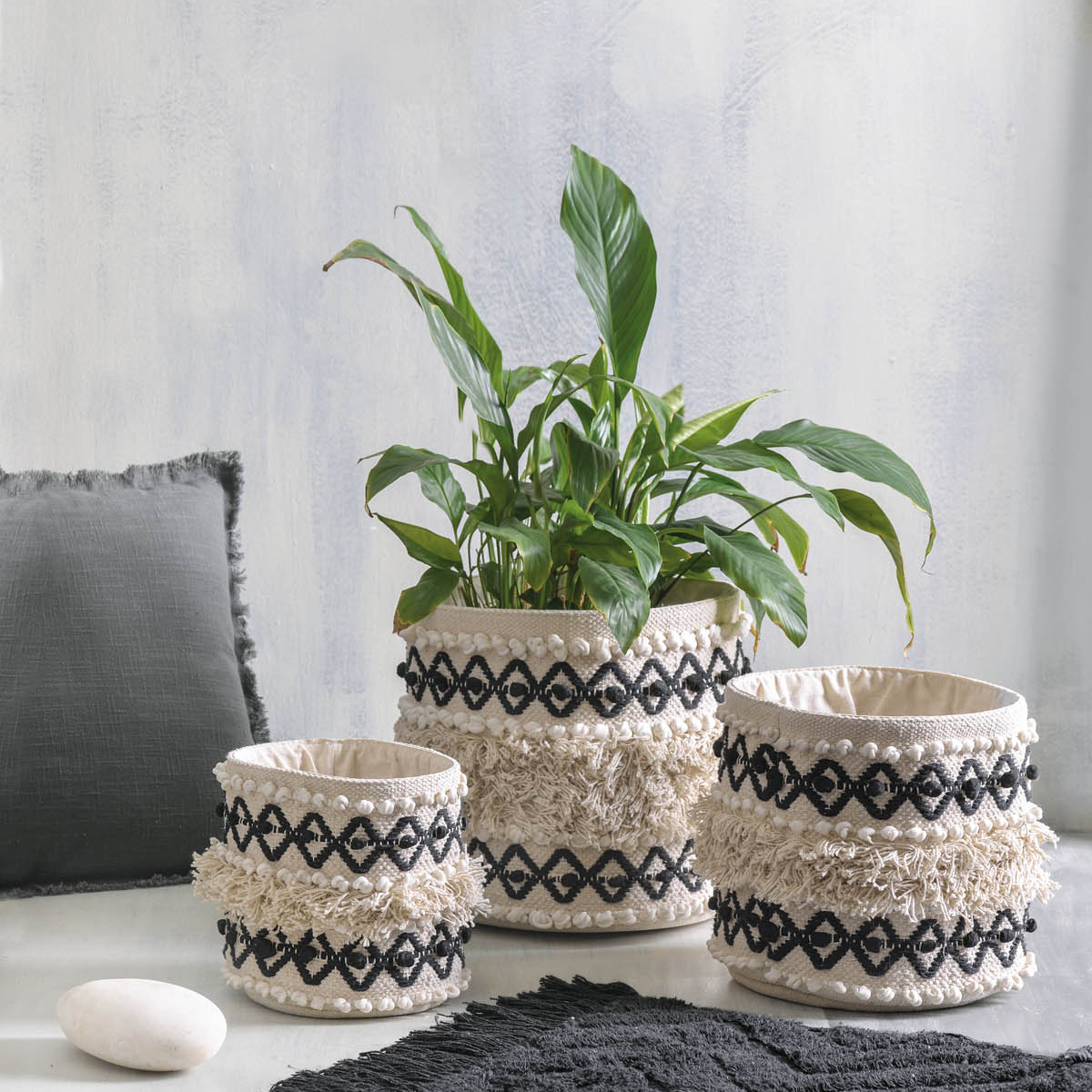 Καλάθι αποθήκευσης μεγάλο σε εκρού χρώμα, μαύρες λεπτομέρειες και μοντέρνο σχέδιο με διακοσμητικά κρόσια από την εταιρεία Rythmos. Είναι υφασμάτινο και κατασκευασμένο από βαμβάκι και polyester. Ιδανικό για να κρατήσει οργανωμένα τα μικροαντικείμενα, τα περιοδικά και ότι άλλο φανταστείτε, δίνοντας παράλληλα μια φρέσκια ανάσα στο χώρο σας.