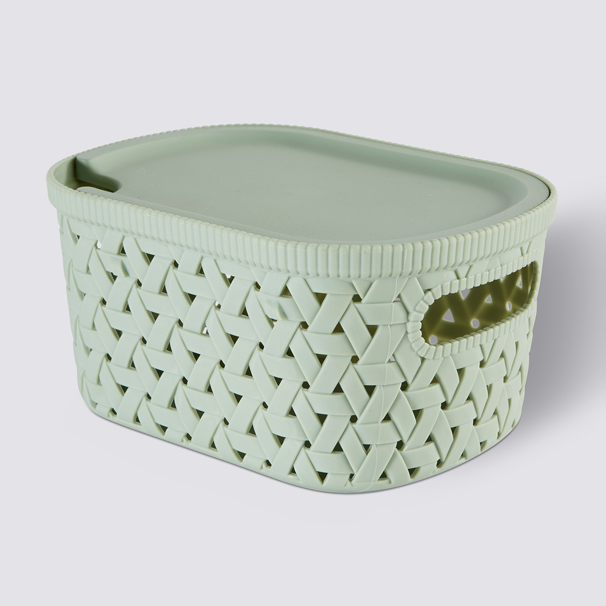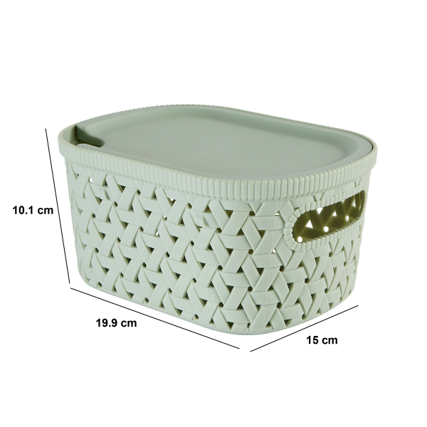Καλάθι αποθήκευσης κατασκευασμένο από πλαστικό υλικό σε χακί απόχρωση με διάτρητη επιφάνεια. Διαθέτει καπάκι και λαβές για εύκολη μεταφορά. Χρησιμεύει σαν αποθηκευτικός χώρο σε ένα ράφι, στο μπάνιο, την ντουλάπα, το παιδικό δωμάτιο ή όπου αλλού χρειάζεται να οργανώσετε μικροπράγματα. Συνδυάστε το με τα υπόλοιπα είδη της ίδιας σειράς για ένα ολοκληρωμένο αποτέλεσμα. Χωρητικότητα 2.3Lt.