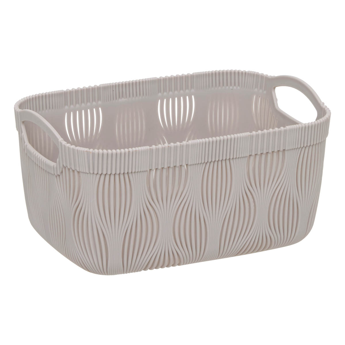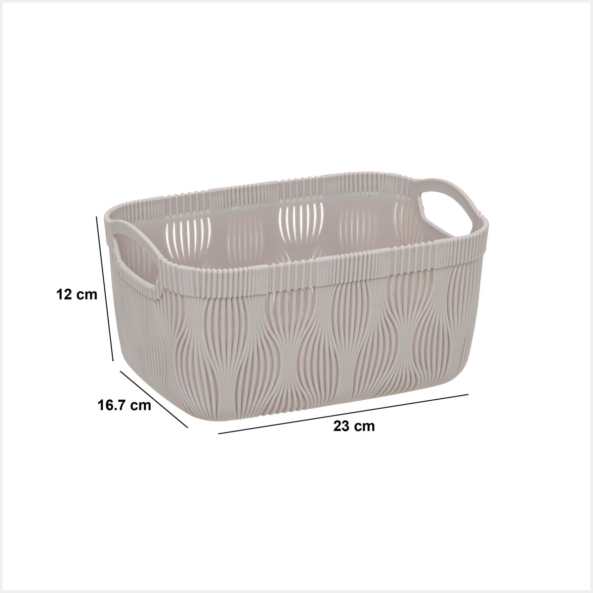 Καλάθιi αποθήκευσης κατασκευασμένο από πλαστικό υλικό με διάτρητο σχέδιο, σε μπεζ χρώμα. Διαθέτει λαβές για εύκολη μεταφορά. Είναι ιδανικά για την οργάνωση του μπάνιου, του δωματίου, της βιβλιοθήκης ακόμα και του παιδικού δωματίου.