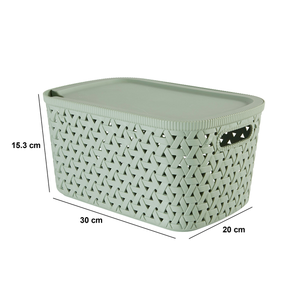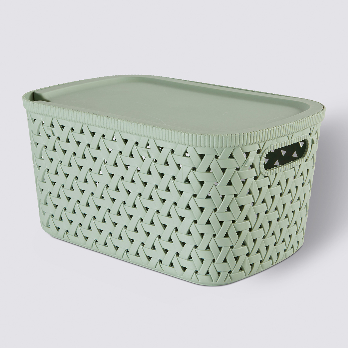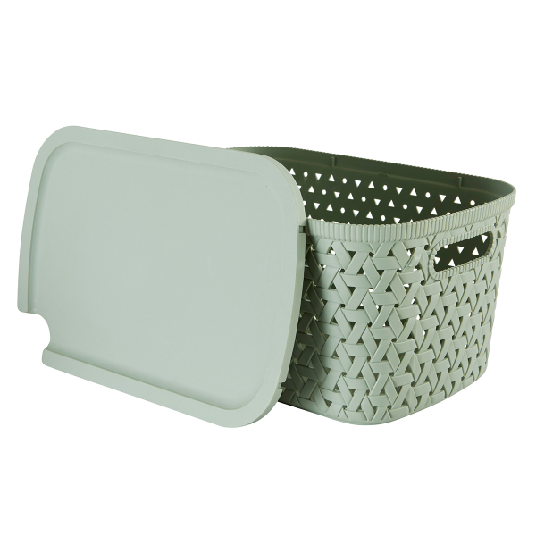 Καλάθι αποθήκευσης κατασκευασμένο από πλαστικό υλικό σε χακί απόχρωση με διάτρητη επιφάνεια. Διαθέτει καπάκι και λαβές για εύκολη μεταφορά. Χρησιμεύει σαν αποθηκευτικός χώρο σε ένα ράφι, στο μπάνιο, την ντουλάπα, το παιδικό δωμάτιο ή όπου αλλού χρειάζεται να οργανώσετε μικροπράγματα. Συνδυάστε το με τα υπόλοιπα είδη της ίδιας σειράς για ένα ολοκληρωμένο αποτέλεσμα. Χωρητικότητα 6.7Lt.