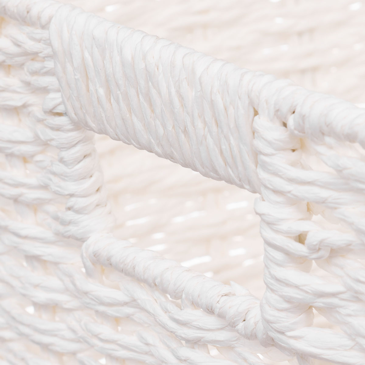 Καλάθι αποθήκευσης σε λευκό χρώμα. Διαθέτει χερούλια για εύκολη μεταφορά. Είναι κατασκευασμένο από χαρτί επεξεργασμένο σαν ψάθα, με μεταλλικό σκελετό. Μπορείτε να το χρησιμοποιήσετε σαν αποθηκευτικό χώρο σε ένα ράφι ή σε όποιο σημείο του σπιτιού επιθυμείτε.