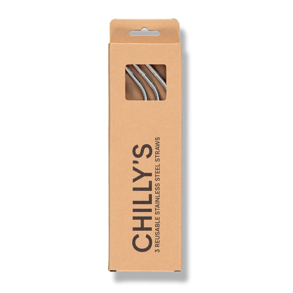 Σετ καλαμάκια σε ασημί απόχρωση της εταιρείας Chilly's. Είναι κατασκευασμένα από υψηλής ποιότητας ανοξείδωτο ατσάλι για να αντέχουν τις χαμηλές θερμοκρασίες. Το σετ περιλαμβάνει 3 επαναχρησιμοποιούμενα ανοξείδωτα καλαμάκια, και βουρτσάκι καθαρισμού.