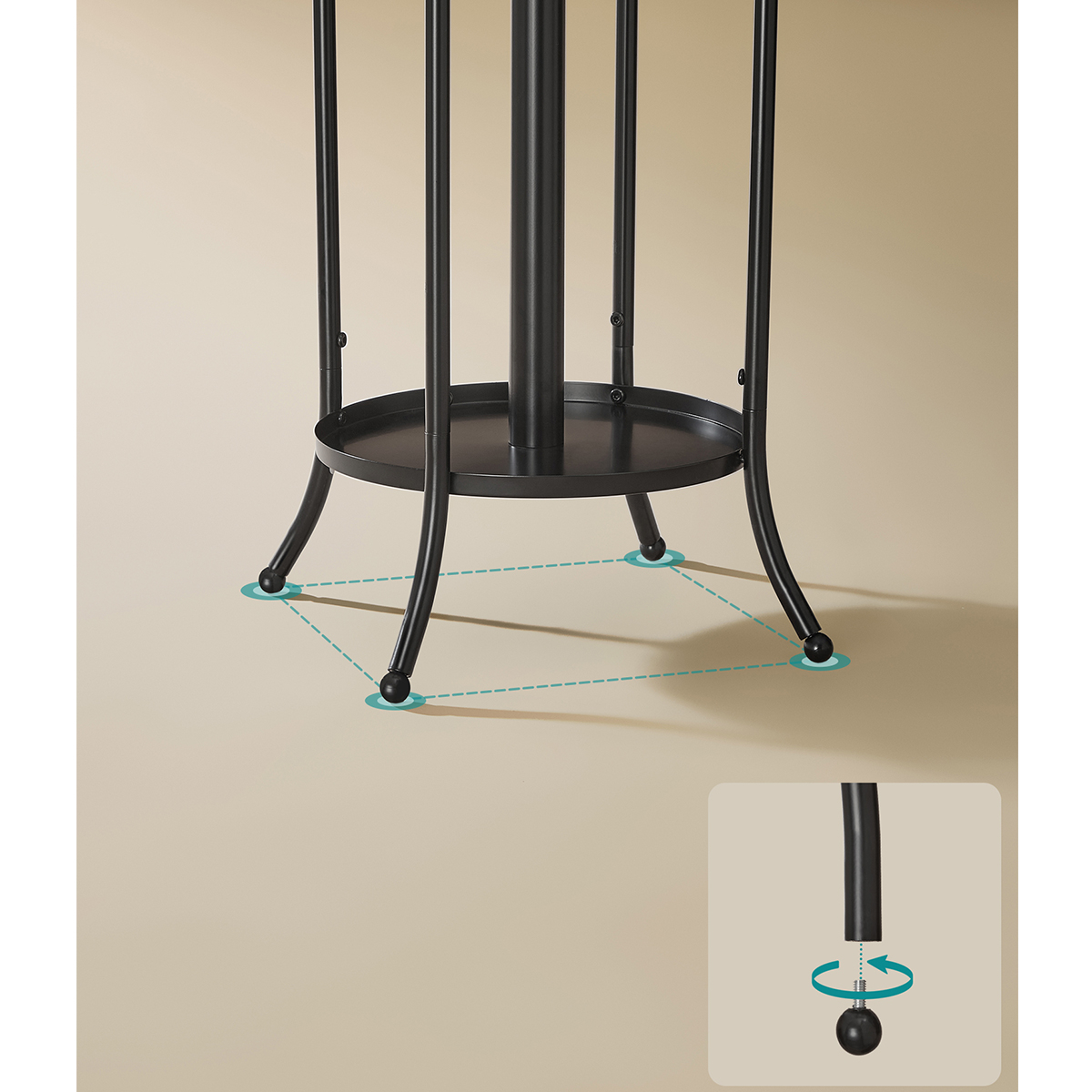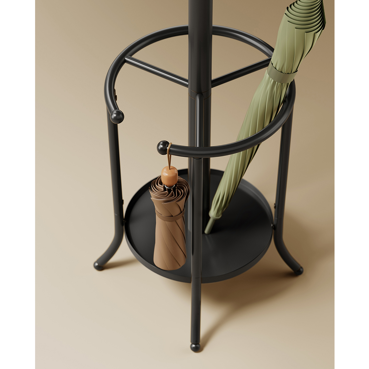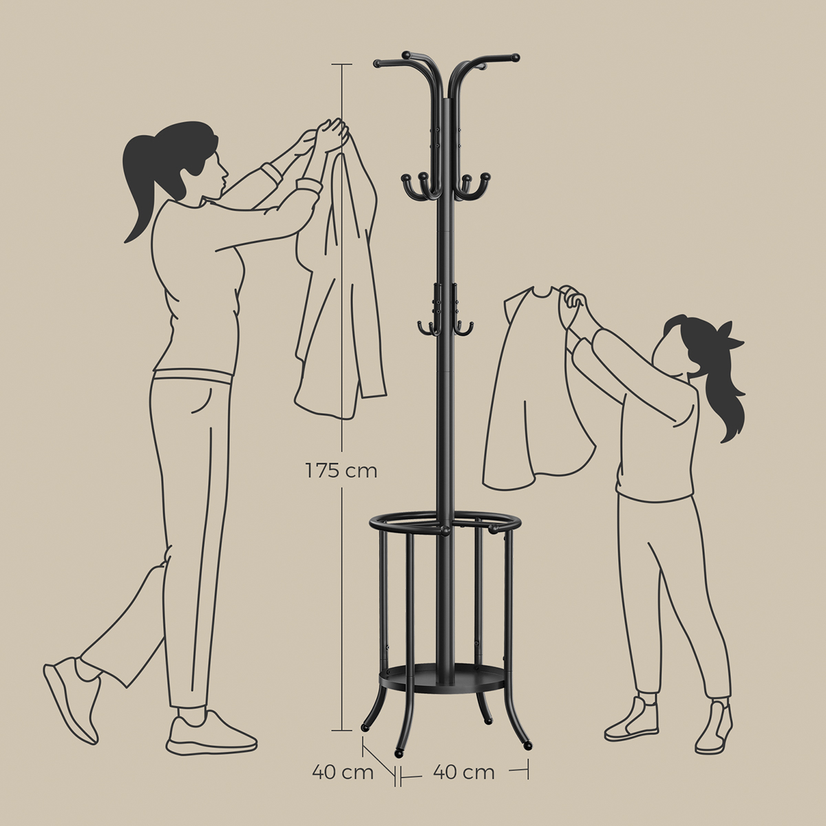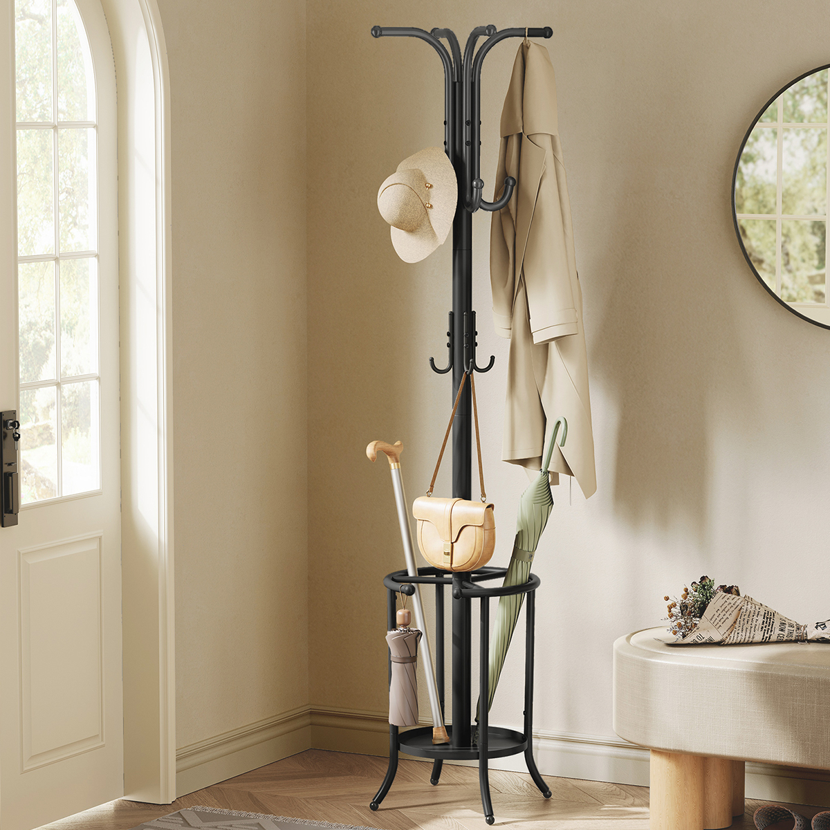 Καλόγερος με μίνιμαλ σχεδιασμό από την εταιρεία Songmics. Είναι κατασκευασμένος από μεταλλικό υλικό σε μαύρο χρώμα και διαθέτει 12 θέσεις κρεμάσματος για τα μπουφάν, τις τσάντες και τα καπέλα σας. Στο κάτω μέρος έχει ομπρελοθήκη για να έχετε πάντα οργανωμένες τις ομπρέλες σας. Ιδανικός για τοποθέτηση στην είσοδο, το χολ, το υπνοδωμάτιο ή όπου αλλού θέλετε και να τακτοποιήσετε τον χώρο δίνοντας παράλληλα στυλ. Μέγιστο βάρος αντοχής ανά γάντζο 4kg. *Το προϊόν έρχεται αμοντάριστο και συναρμολογείται βάσει οδηγιών.*
