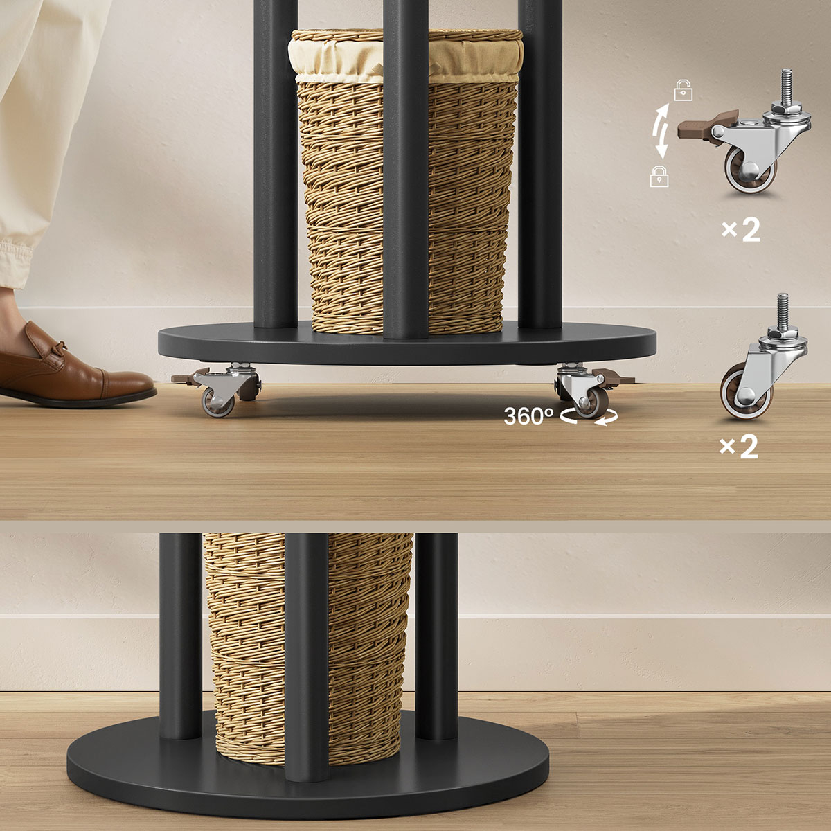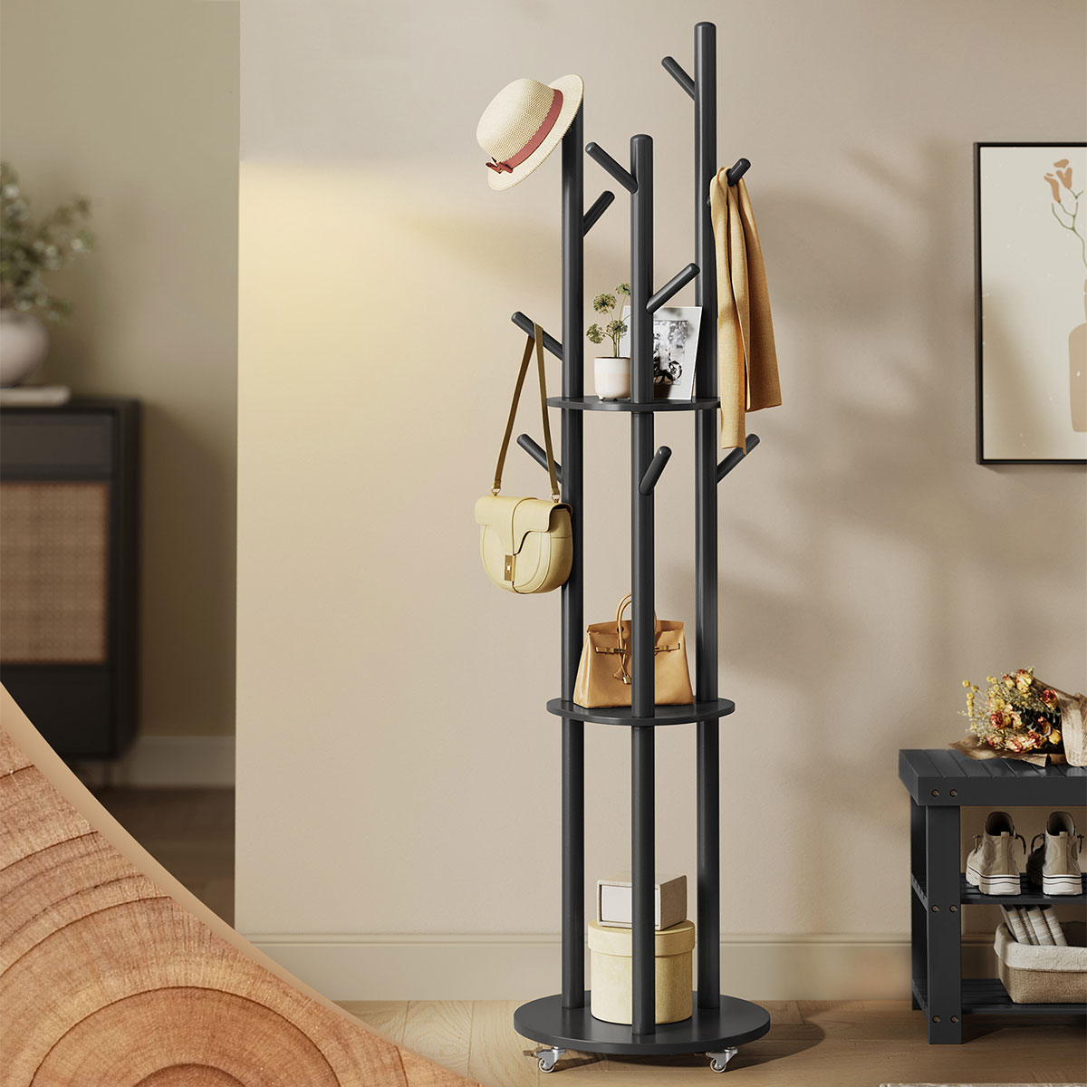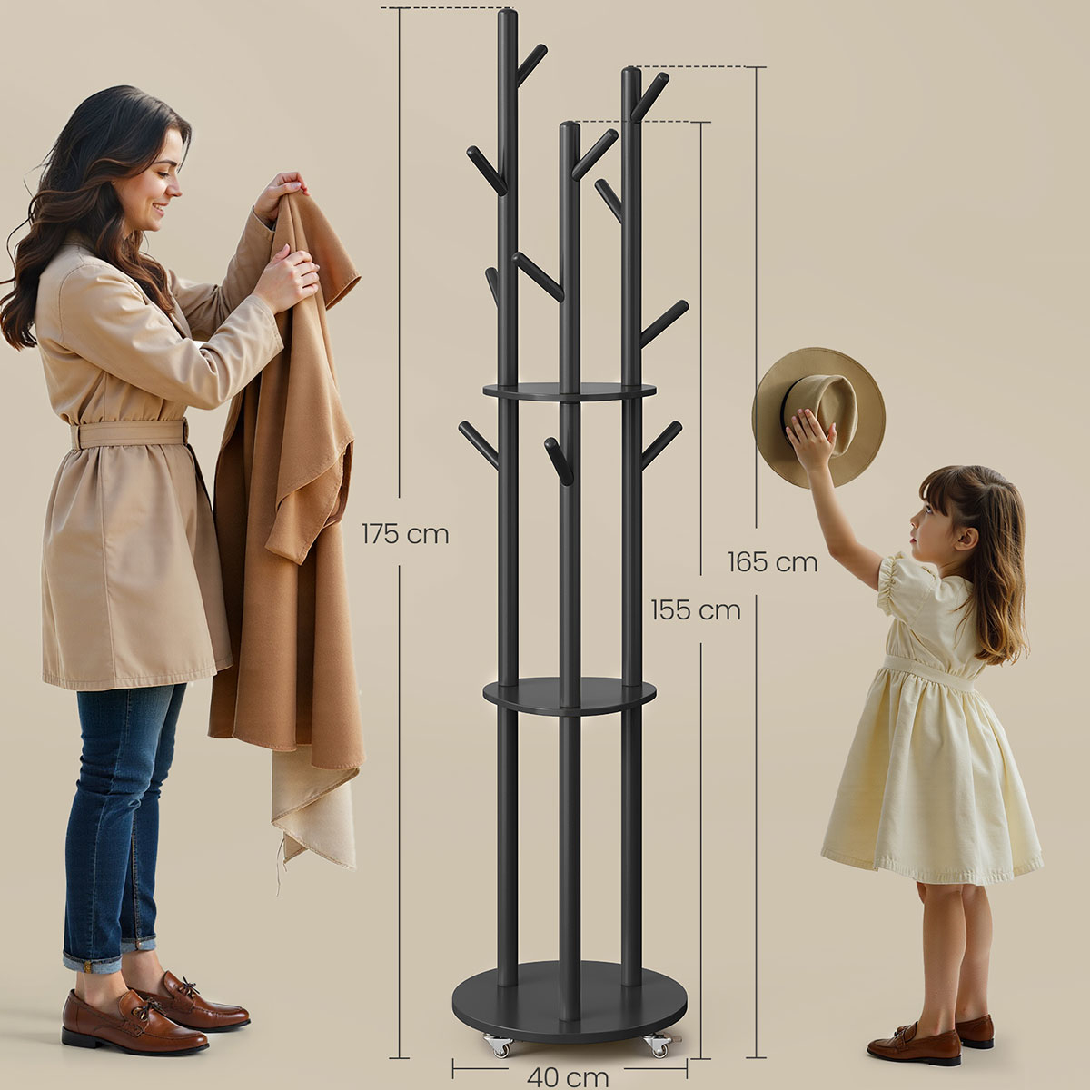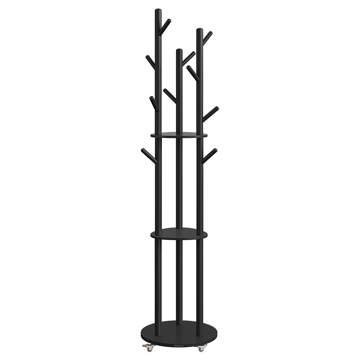 Καλόγερος με ράφια και μοντέρνο σχεδιασμό από την εταιρεία Vasagle. Είναι κατασκευασμένος από ξύλο MDF σε μαύρο χρώμα με μεταλλικά και πλαστικά μέρη και διαθέτει 3 ράφια για να ακουμπάτε τα πράγματα σας. Έχει 10 θέσεις κρεμάσματος για τα μπουφάν, τις τσάντες ή τα καπέλα σας. Είναι τροχήλατος με 4 ροδάκια εκ των οποίων τα 2 διαθέτουν φρένο για μέγιστη σταθερότητα. Τα ροδάκια είναι προαιρετικό αν θέλετε να τα τοποθετήσετε ή όχι. Ιδανικός για τοποθέτηση στην είσοδο, το χολ, το υπνοδωμάτιο ή όπου αλλού θέλετε. Μέγιστο βάρος αντοχής ραφιού: 5kg. Μέγιστο βάρος αντοχής ανά άγκιστρο 3kg. Συνολικό μέγιστο βάρος αντοχής: 40kg. *Το προϊόν έρχεται αμοντάριστο και συναρμολογείται βάσει οδηγιών.*