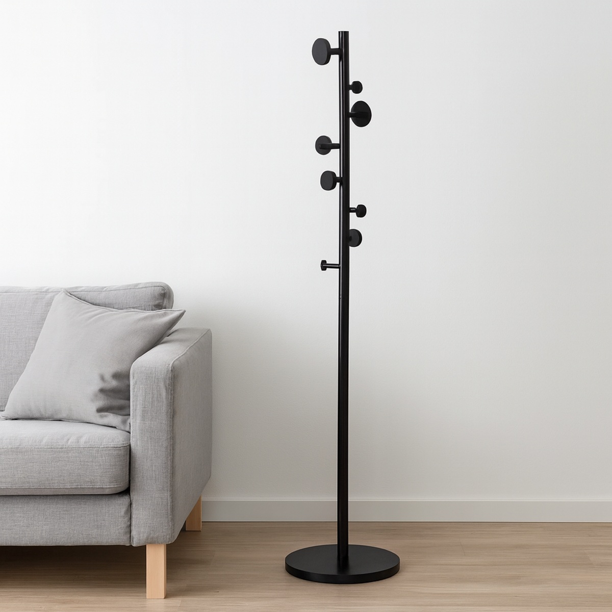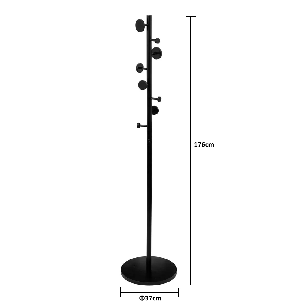 Καλόγερος ρούχων με 8 κρεμαστράκια, για να κρεμάσετε μπουφάν, παλτό, κασκόλ και τσάντες. Είναι κατασκευασμένος από ξύλινο MDF σε μαύρο χρώμα, με μίνιμαλ σχεδιασμό. Ιδανικός για τοποθέτηση στην είσοδο, το χολ, το υπνοδωμάτιο. Το προϊόν έρχεται αμοντάριστο και συναρμολογείται βάσει οδηγιών. Μέγιστο βάρος αντοχής: 16 κιλά.