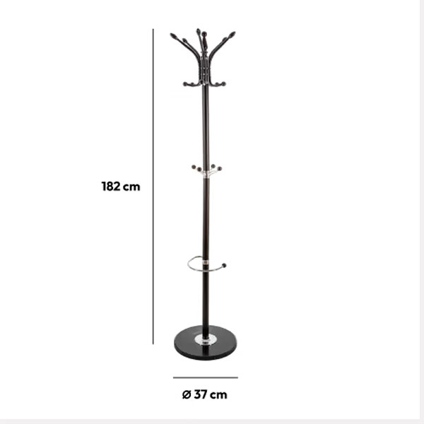 Καλόγερος ρούχων σε μαύρο χρώμα με ασημί λεπτομέρειες. Διαθέτει θέσεις για τα πανωφώρια σας και θέση για τις ομπρέλες σας. Ιδανικός για τοποθέτηση στην είσοδο, το χολ, το υπνοδωμάτιο ή όπου αλλού σας είναι χρήσιμος. Το προϊόν έρχεται αμοντάριστο και συναρμολογείται βάσει οδηγιών.
