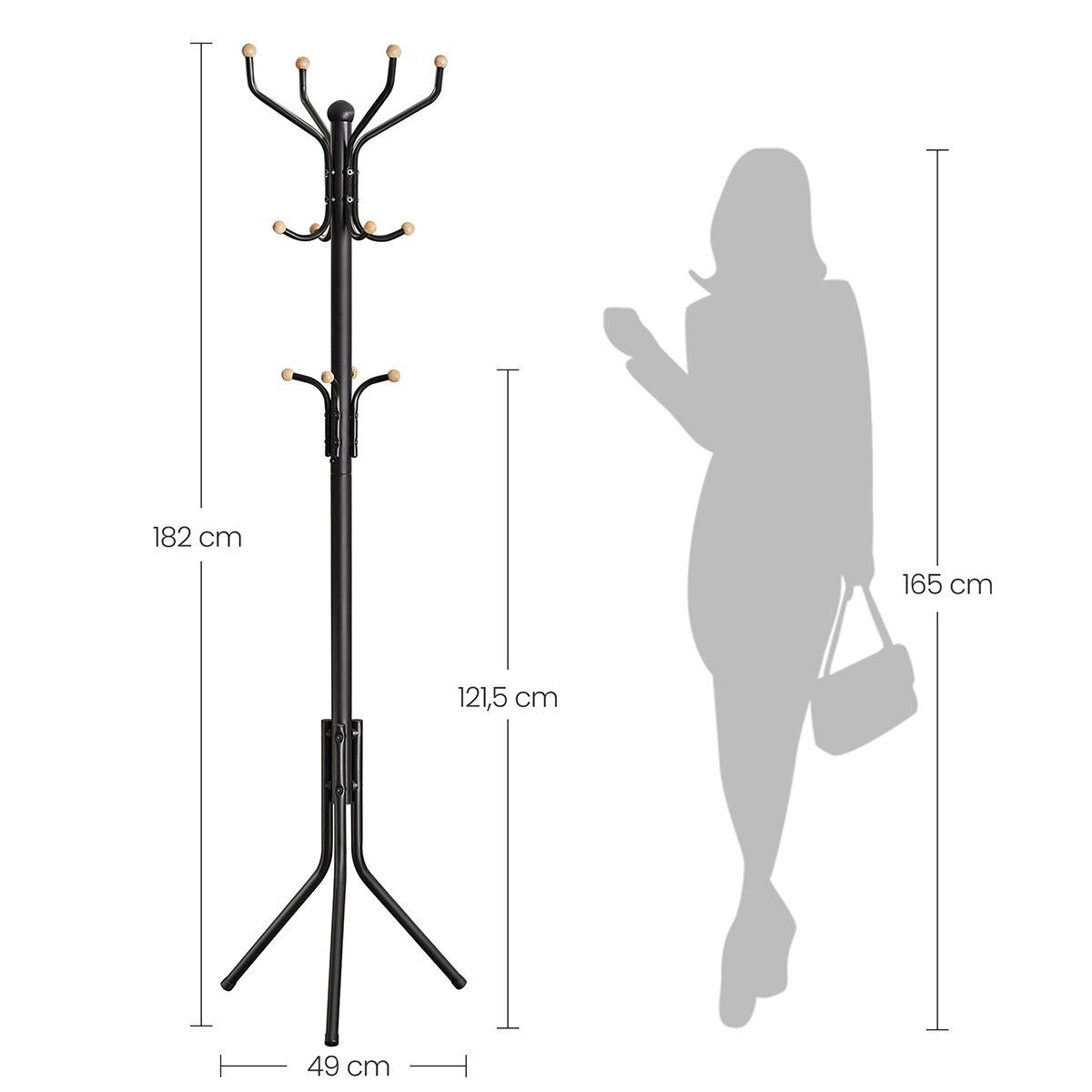 Καλόγερος με μίνιμαλ σχεδιασμό από την εταιρεία Songmics. Είναι κατασκευασμένος από μεταλλικό υλικό σε μαύρο χρώμα με μπεζ ξύλινες λεπτομέρειες και διαθέτει 12 θέσεις κρεμάσματος για τα μπουφάν, τις τσάντες και τα καπέλα σας. Ιδανικός για τοποθέτηση στην είσοδο, το χολ, το υπνοδωμάτιο ή όπου αλλού θέλετε και να τακτοποιήσετε τον χώρο δίνοντας παράλληλα στυλ. Μέγιστο βάρος αντοχής 36kg. *Το προϊόν έρχεται αμοντάριστο και συναρμολογείται βάσει οδηγιών.*