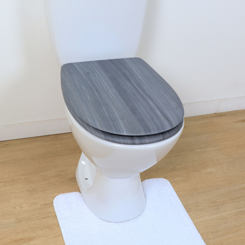 Καπάκι για την τουαλέτα κατασκευασμένο από ξύλο MDF σε γκρι χρώμα με εφέ ξύλου. Έχει συμπαγή και στιβαρή κατασκευή με οβάλ σχήμα. Διαθέτει ανοξείδωτους μεντεσέδες, που το καθιστούν ανθεκτικό στα καθαριστικά και την καθημερινή χρήση.