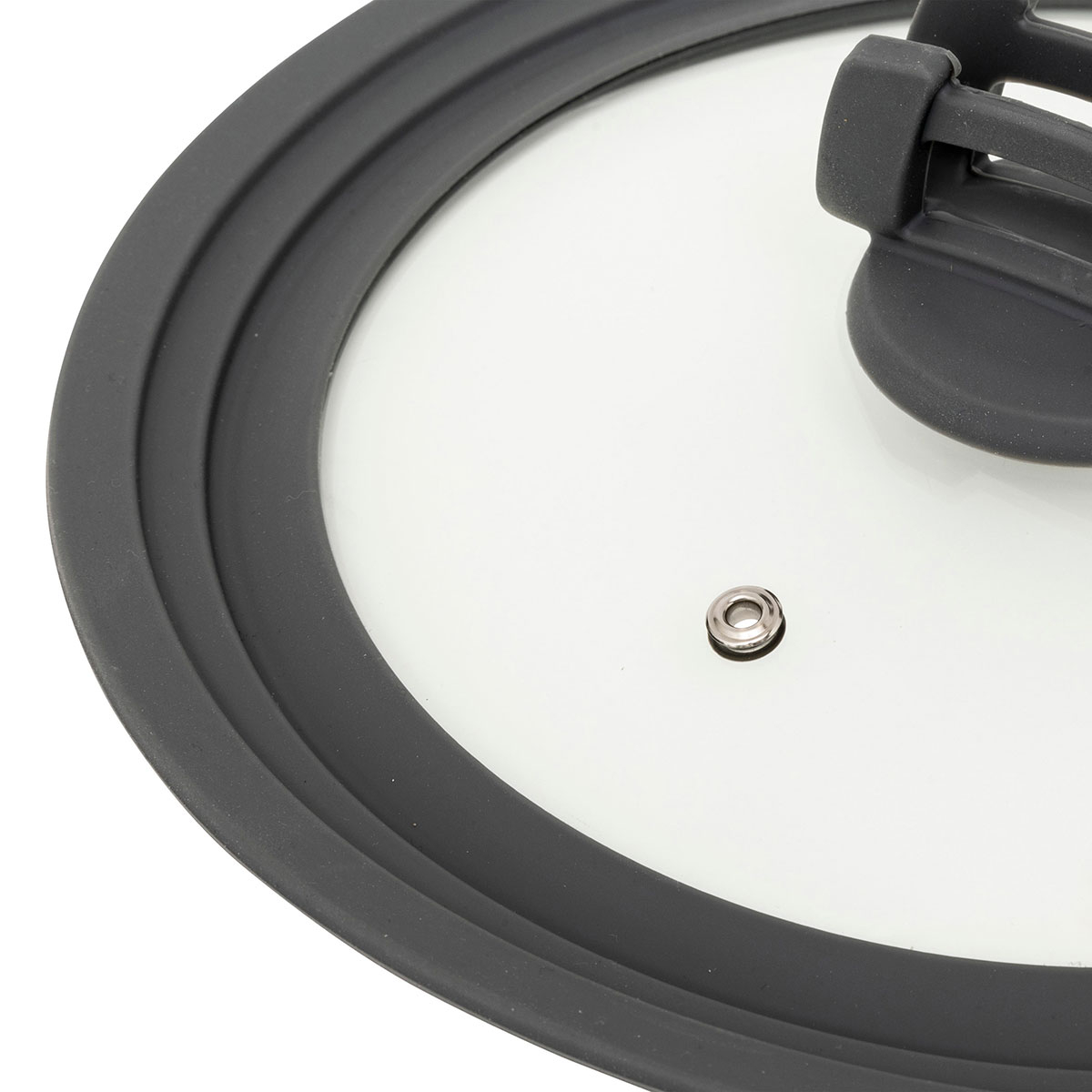 Γυάλινο καπάκι για τηγάνι ή κατσαρόλες με διάμετρο 27.5εκ. Είναι πυράντοχο με περιμετρικό στεφάνι σιλικόνης και διαθέτει οπή διαφυγής ατμού. Η λαβή του είναι αντιολισθητική από σιλικόνη και πάνω στη λαβή διαθέτει βάση για κουτάλα. Είναι κατάλληλο για κατσαρόλες και τηγάνια με διάμετρο 22εκ., 24εκ., 26εκ. Μπορεί να τοποθετηθεί σε φούρνο με μέγιστη θερμοκρασία αντοχής 250°.