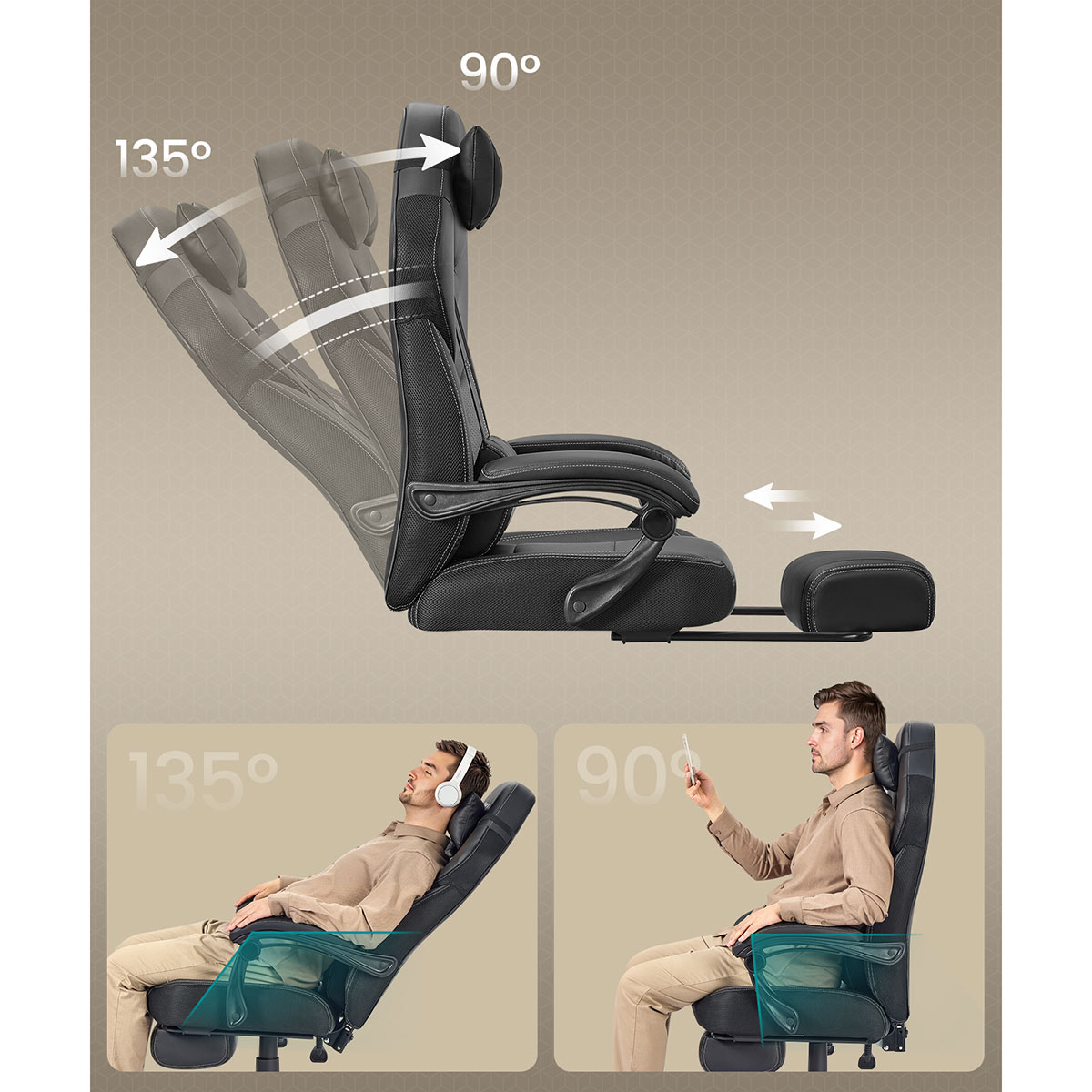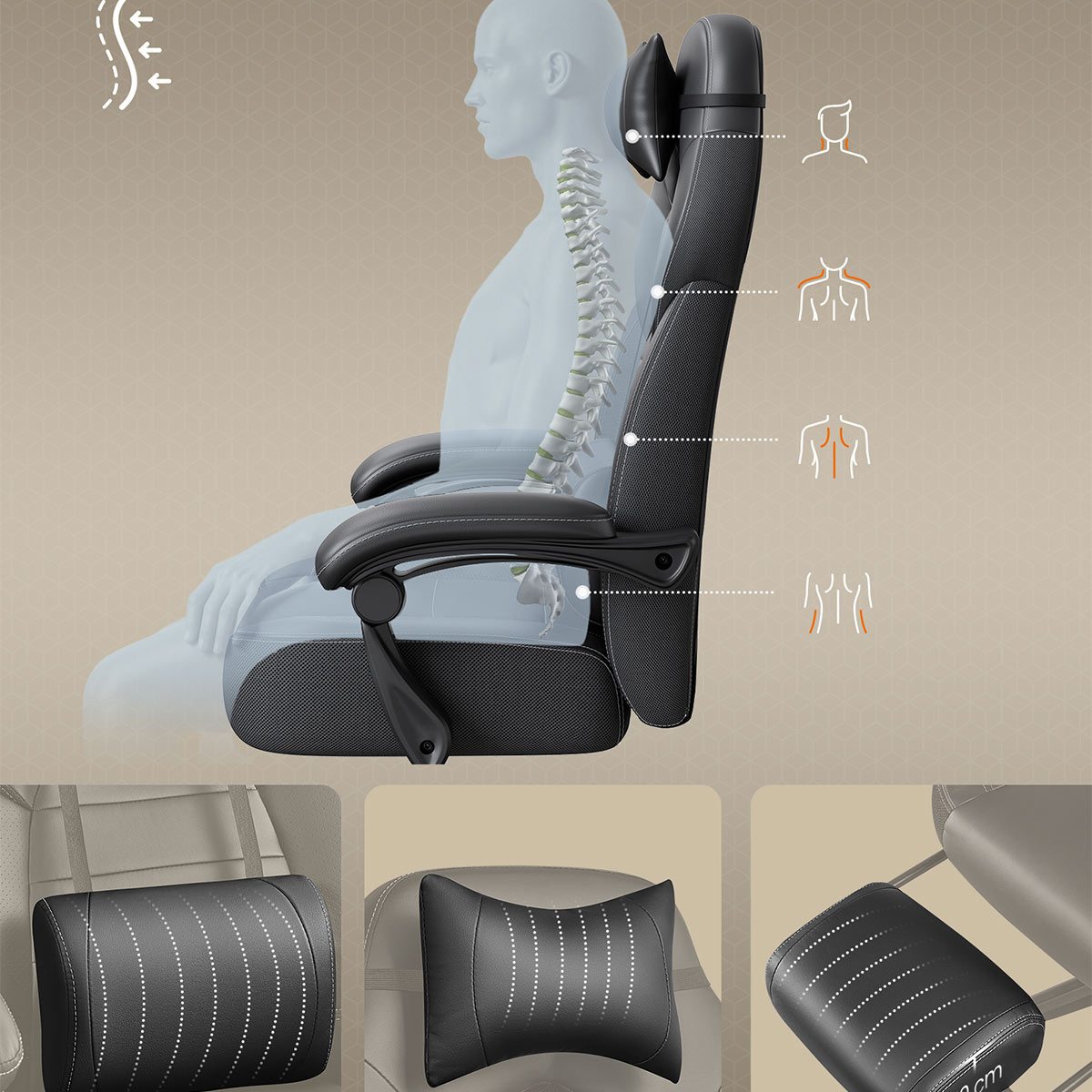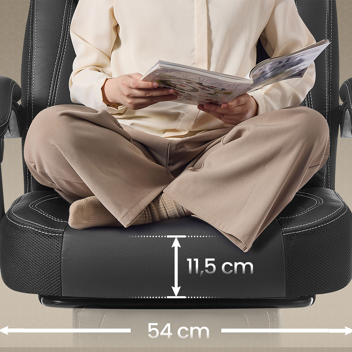 Εργονομική καρέκλα γραφείου με μπράτσα από την εταιρεία Songmics. Είναι κατασκευασμένη από δερματίνη (PU) σε μαύρο χρώμα, με μεταλλικά και πλαστικά μέρη. Για μεγαλύτερη άνεση διαθέτει υποπόδιο, μαξιλάρι στον αυχένα και μαξιλάρι μέσης. Το κάθισμα έχει διάτρητο ύφασμα για να αερίζεται. Διαθέτει πτυσσόμενο κάθισμα για να ρυθμίζετε το ύψος της από 71εκ.Υ έως 83εκ.Υ. Ιδανική καρέκλα με ροδάκια για τη δουλειά, το διάβασμα και το gaming. Ύψος πλάτης: 68εκ. Ύψος καθίσματος 53-65εκ. Μέγιστο βάρος αντοχής 150kg. *Το προϊόν έρχεται αμοντάριστο και συναρμολογείται βάσει οδηγιών.*