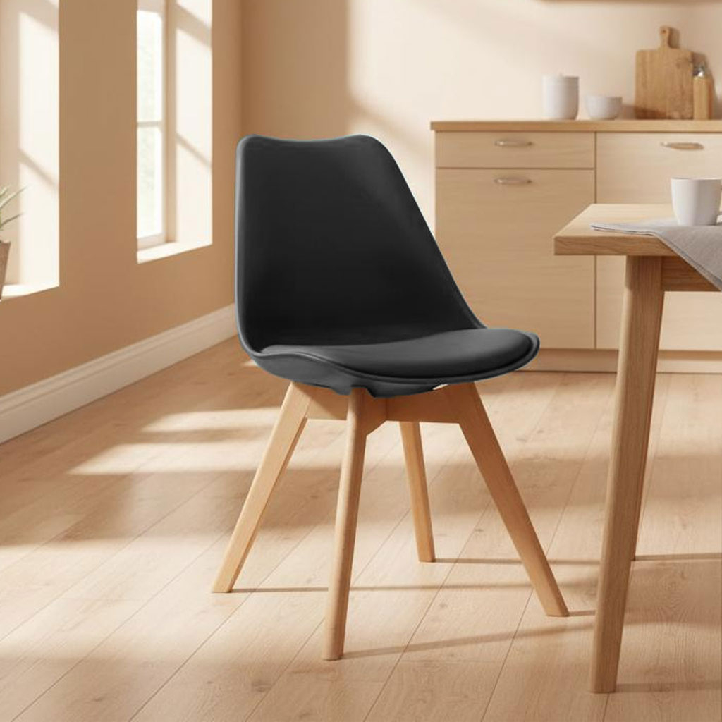 Καρέκλα με μίνιμαλ σχεδιασμό σε μαύρο χρώμα κατάλληλη για την τραπεζαρία ή την κουζίνα σας. Το μαλακό κάθισμά της εξασφαλίζει άνεση, ενώ τα ανθεκτικά πόδια της παρέχουν σταθερότητα. Μπορεί να συνδυαστεί με τα περισσότερα στυλ τραπεζαρίας για να δημιουργήσετε τον χώρο που επιθυμείτε. Το προϊόν έρχεται αμοντάριστο και συναρμολογείται βάσει οδηγιών.