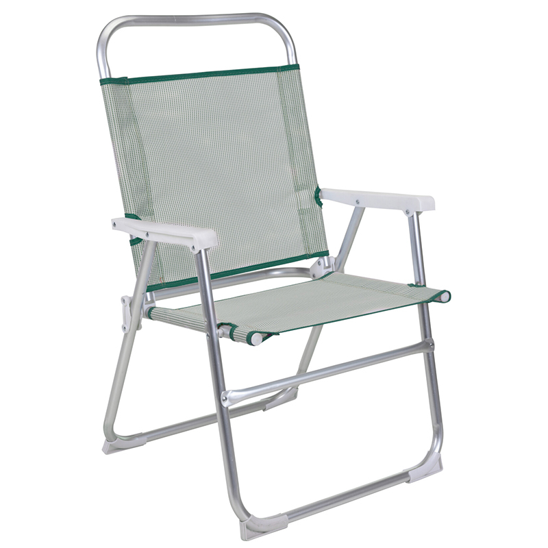 Αναδιπλούμενο καρεκλάκι παραλίας με μπράτσα. Έχει ψηλά πόδια, με απόσταση από το έδαφος μέχρι την επιφάνεια καθίσματος 37εκ. και ψηλή πλάτη για περισσότερη άνεση. Ο σκελετός του είναι κατασκευασμένος από αλουμίνιο με διατομή σωλήνα Φ2.2εκ. Το ύφασμα είναι 100% polyester σε χακί χρώμα ενώ διαθέτει πλαστικά μέρη σε λευκό χρώμα. Ιδανικό καρεκλάκι για κάμπινγκ, ψάρεμα ή άλλων υπαίθριων δραστηριοτήτων. Μέγιστο βάρος ανοχής 120kg.