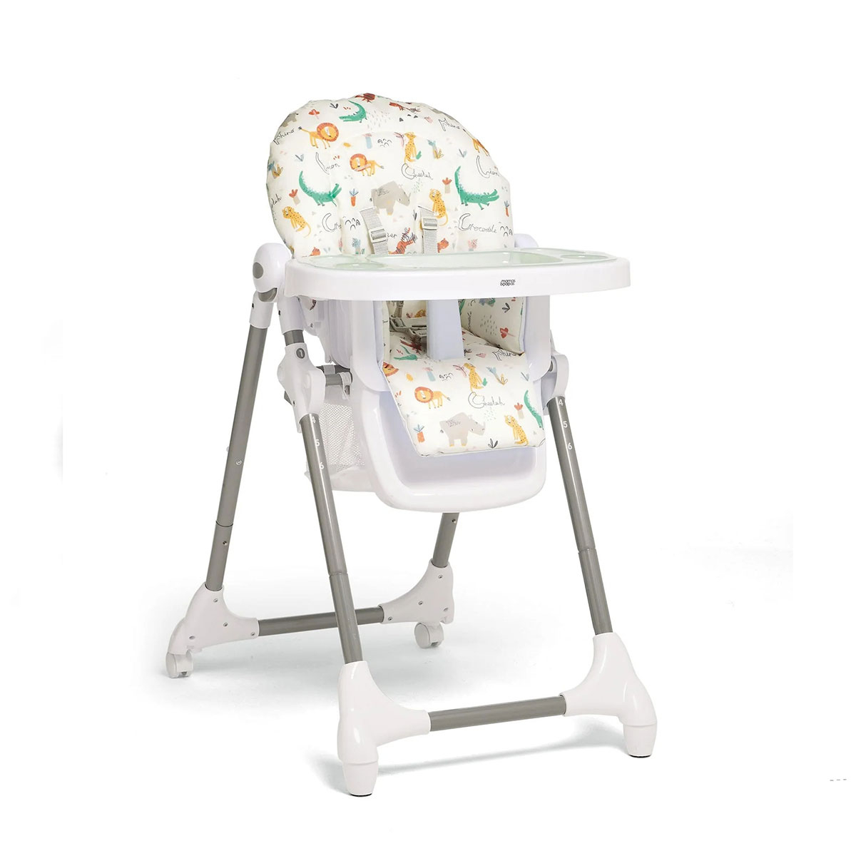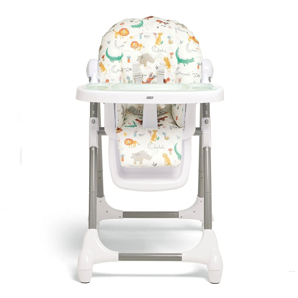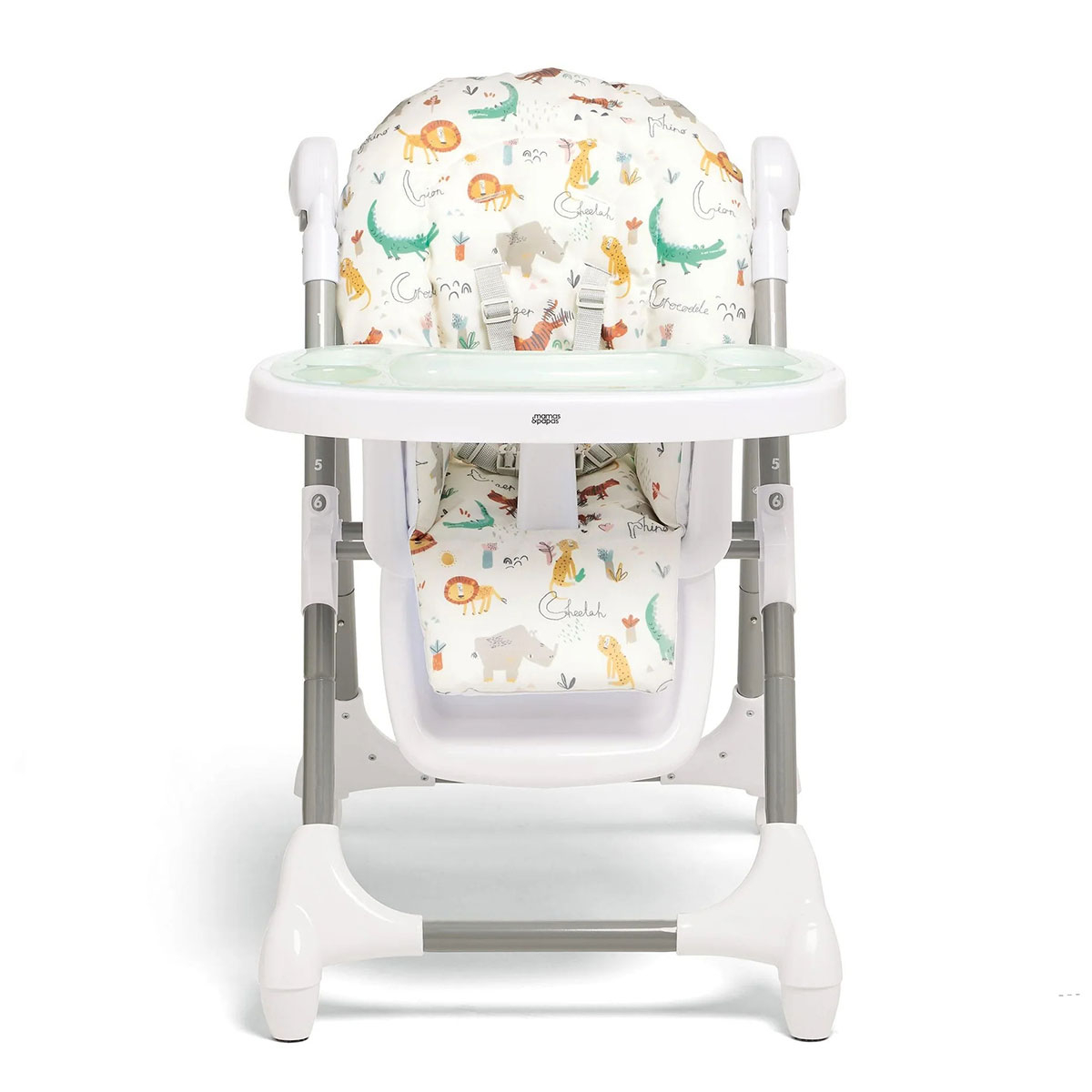 Καρέκλα φαγητού της εταιρείας Mamas & Papas σε λευκό χρώμα με πολύχρωμο σχέδιο με ζωάκια. Ιδανικό καρεκλάκι για τα πρώτα γεύματα του μωρού σας. Διαθέτει μια ποικιλία ρυθμίσεων, συμπεριλαμβανομένων έξι ρυθμίσεων ύψους, 3 θέσεων ανάκλισης και 3 ρυθμίσεων δίσκου. Έχει άνετο επενδεδυμένο κάθισμα. Είναι ιδανικό καρεκλάκι για εξοικονόμηση χώρου καθώς μπορεί να διπλωθεί συμπαγής με το δίσκο να είναι ακόμα συνδεδεμένο. Περιλαμβάνει κλειδωμένους τροχούς. Η ζώνη πέντε σημείων κρατά το μικρό σας ασφαλές ανά πάσα στιγμή. Κατασκευασμένη κάτω από το πρότυπα ασφαλείας EN14988.